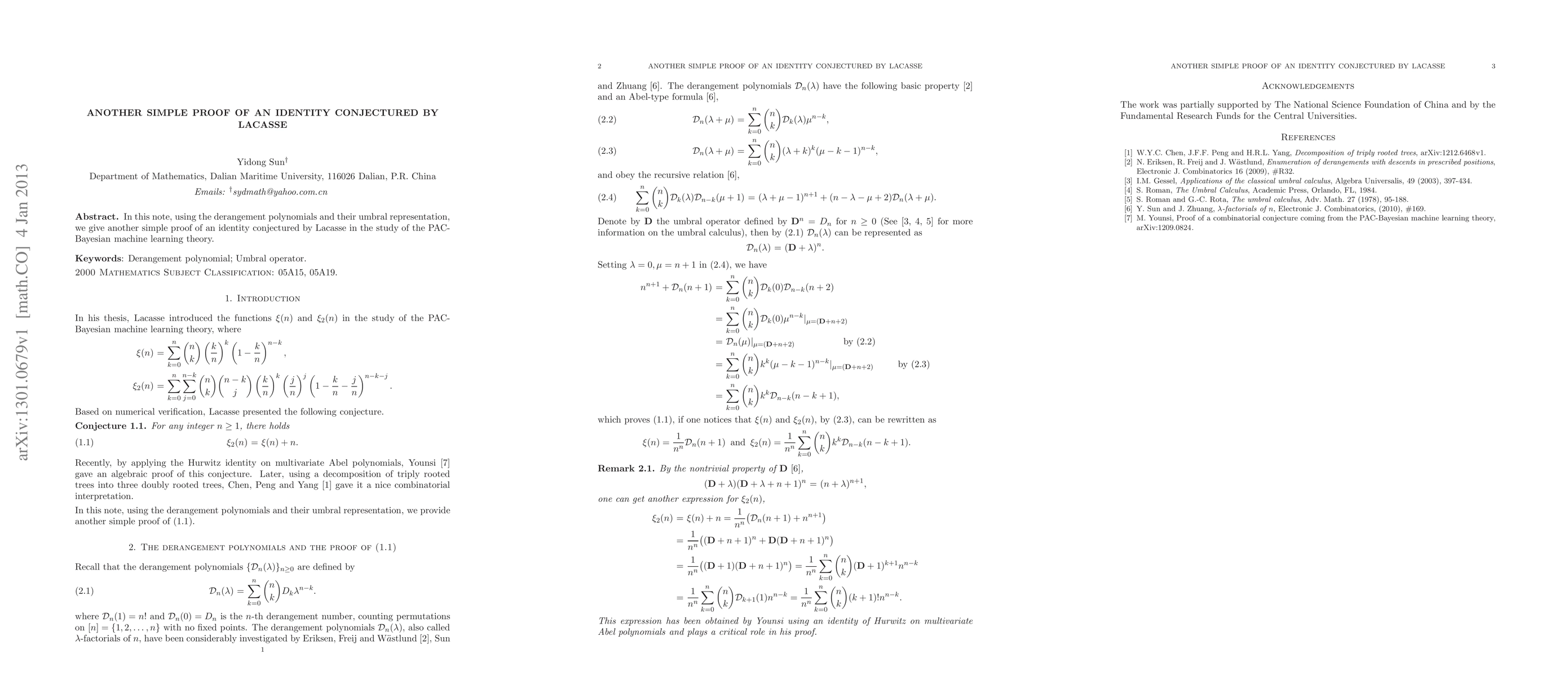 This paper provides a straightforward proof of a conjectured identity by Lacasse using derangement polynomials and their umbral representation, contributing to the PAC-Bayesian framework in machine learning theory.