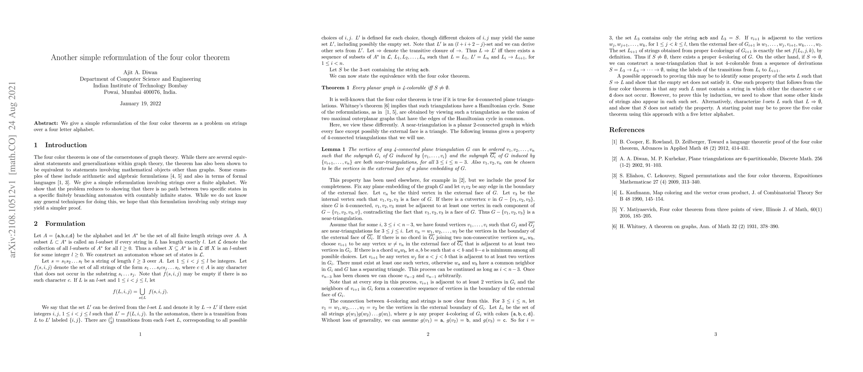 We give a simple reformulation of the four color theorem as a problem on strings over a four letter alphabet.
