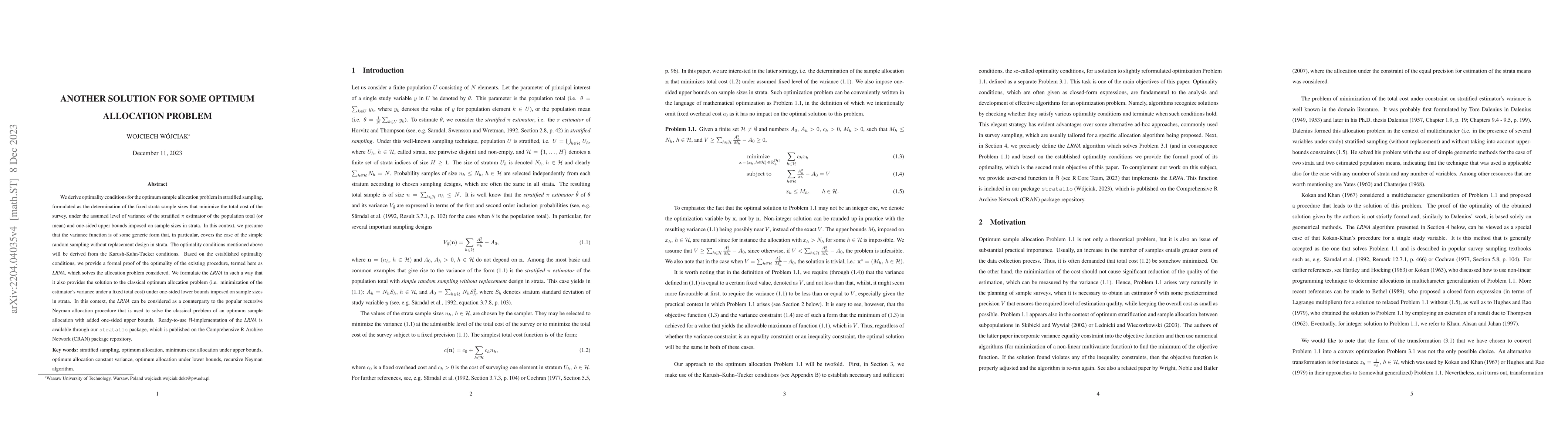 This paper derives optimality conditions for stratified sampling allocation to minimize survey costs while controlling variance and imposing sample size bounds. It proves the optimality of the LRNA procedure, which also addresses the classical allocation problem under lower bounds, and provides an R implementation available on CRAN.