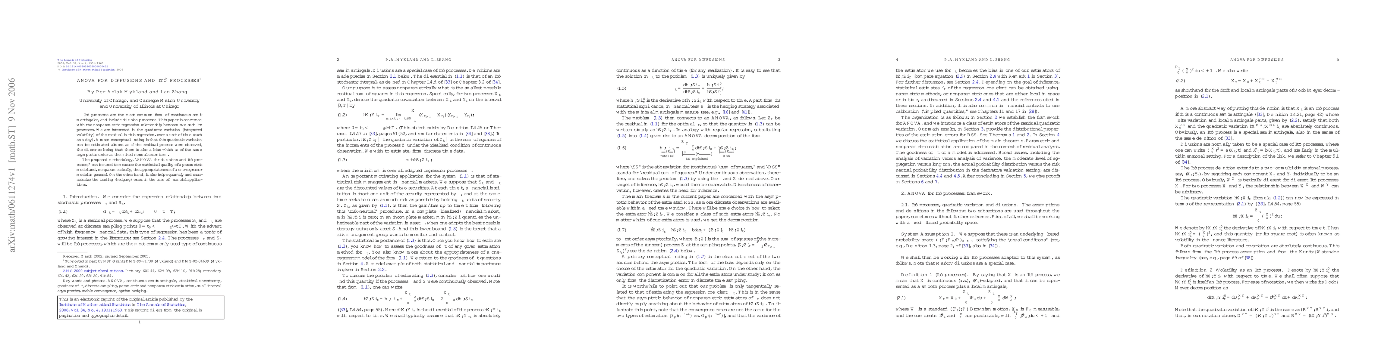 This paper introduces 'ANOVA for diffusions and Itô processes' to estimate the quadratic variation (integrated volatility) of residuals in the regression relationship between two Itô processes. The method shows that this estimation can be nearly as accurate as if the residual process were directly observable, despite a bias of the same asymptotic order as the normal error term. This approach aids in assessing parametric model quality, evaluating one-regressor models, and quantifying trading errors in financial applications.