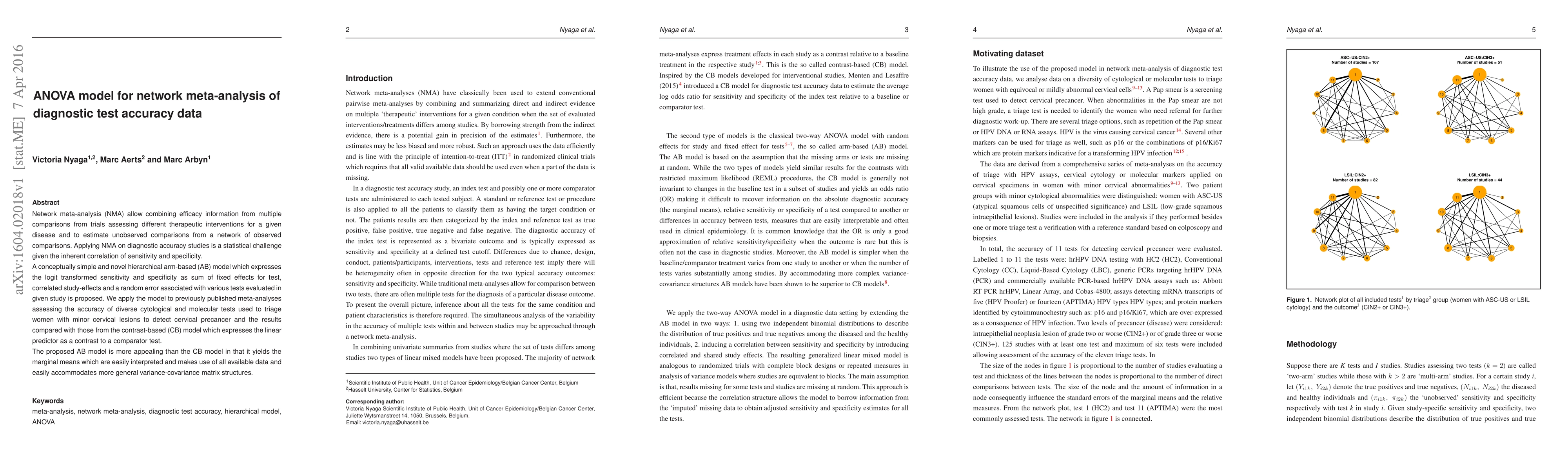 Network meta-analysis (NMA) allow combining efficacy information from multiple comparisons from trials assessing different therapeutic interventions for a given disease and to estimate unobserved comparisons from a network of observed comparisons. Applying NMA on diagnostic accuracy studies is a statistical challenge given the inherent correlation of sensitivity and specificity. A conceptually simple and novel hierarchical arm-based (AB) model which expresses the logit transformed sensitivity and specificity as sum of fixed effects for test, correlated study-effects and a random error associated with various tests evaluated in given study is proposed. We apply the model to previously published meta-analyses assessing the accuracy of diverse cytological and molecular tests used to triage women with minor cervical lesions to detect cervical precancer and the results compared with those from the contrast-based (CB) model which expresses the linear predictor as a contrast to a comparator test. The proposed AB model is more appealing than the CB model in that it yields the marginal means which are easily interpreted and makes use of all available data and easily accommodates more general variance-covariance matrix structures.