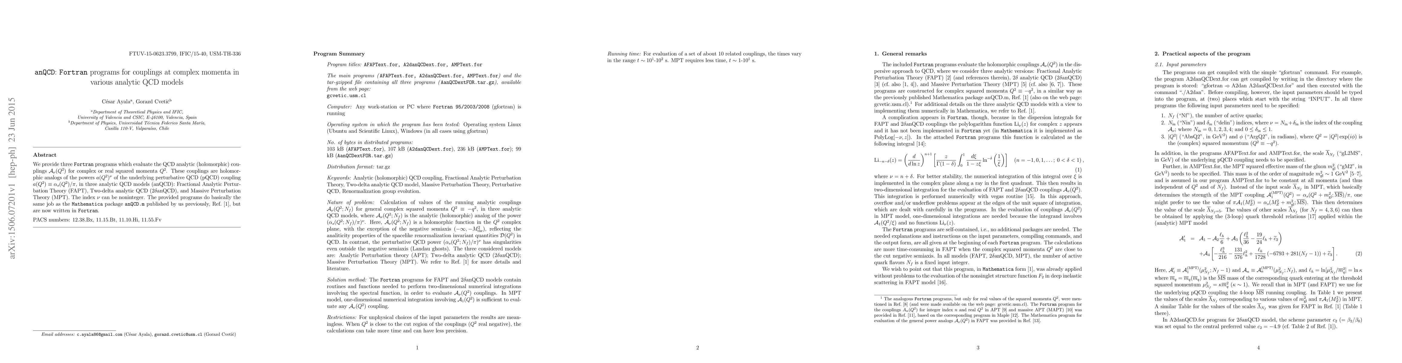 We provide three Fortran programs which evaluate the QCD analytic (holomorphic) couplings $\mathcal{A}_{\nu}(Q^2)$ for complex or real squared momenta $Q^2$. These couplings are holomorphic analogs of the powers $a(Q^2)^{\nu}$ of the underlying perturbative QCD (pQCD) coupling $a(Q^2) \equiv \alpha_s(Q^2)/\pi$, in three analytic QCD models (anQCD): Fractional Analytic Perturbation Theory (FAPT), Two-delta analytic QCD (2$\delta$anQCD), and Massive Perturbation Theory (MPT). The index $\nu$ can be noninteger. The provided programs do basically the same job as the Mathematica package anQCD.m in Mathematica published by us previously, Ref.[1], but are now written in Fortran.
