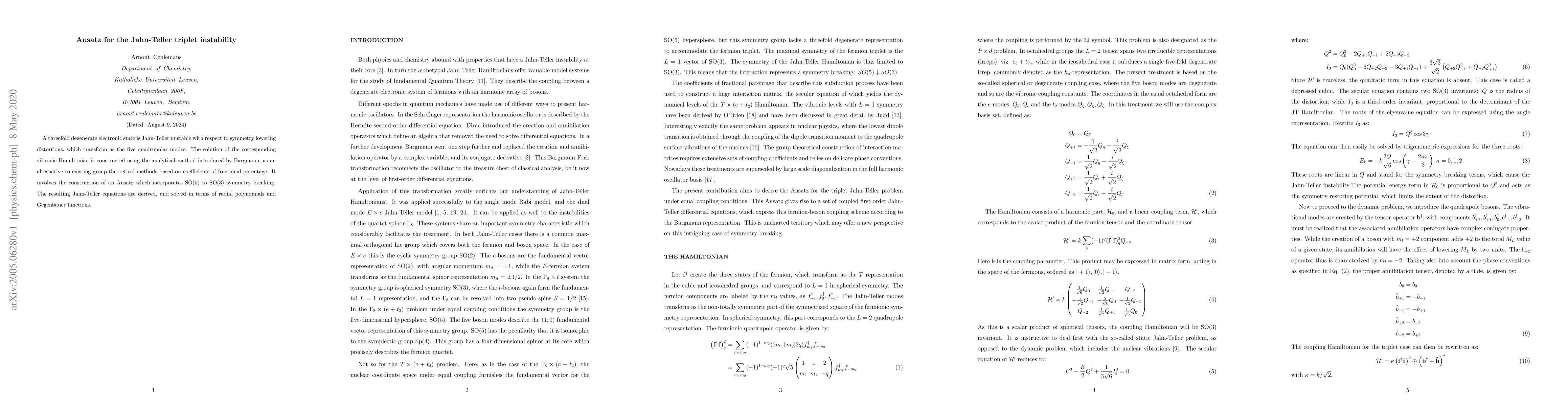 This paper proposes a new method to study the Jahn-Teller triplet instability using an analytical approach based on Bargmann's method, which incorporates SO(5) to SO(3) symmetry breaking and solves for radial polynomials and Gegenbauer functions.