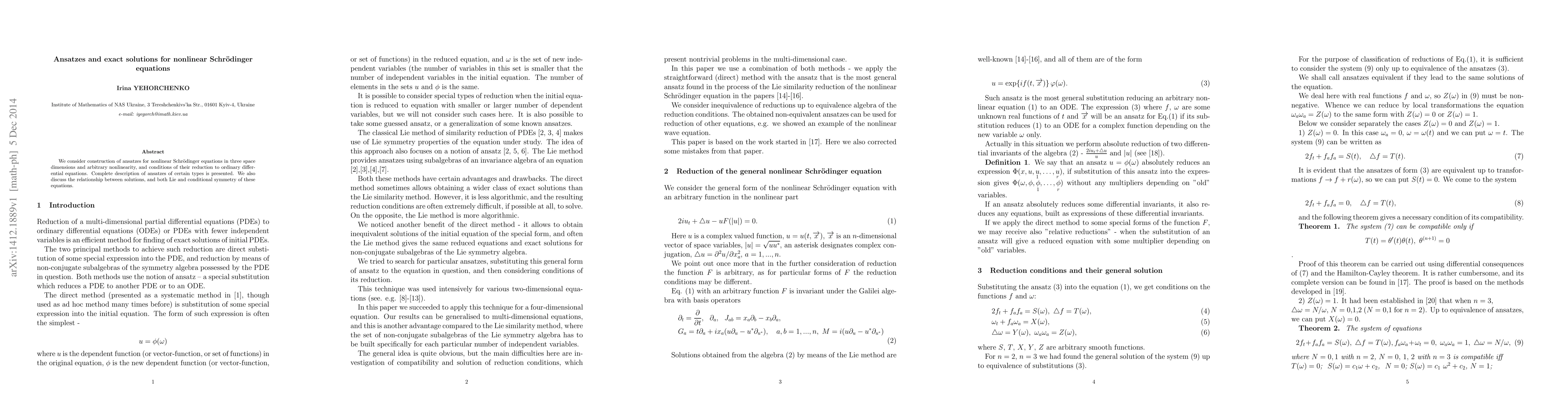 This paper explores the construction of ansatzes for three-dimensional nonlinear Schrödinger equations with arbitrary nonlinearity, detailing conditions under which they reduce to ordinary differential equations. It also investigates the relationship between solutions and the Lie and conditional symmetries of these equations.