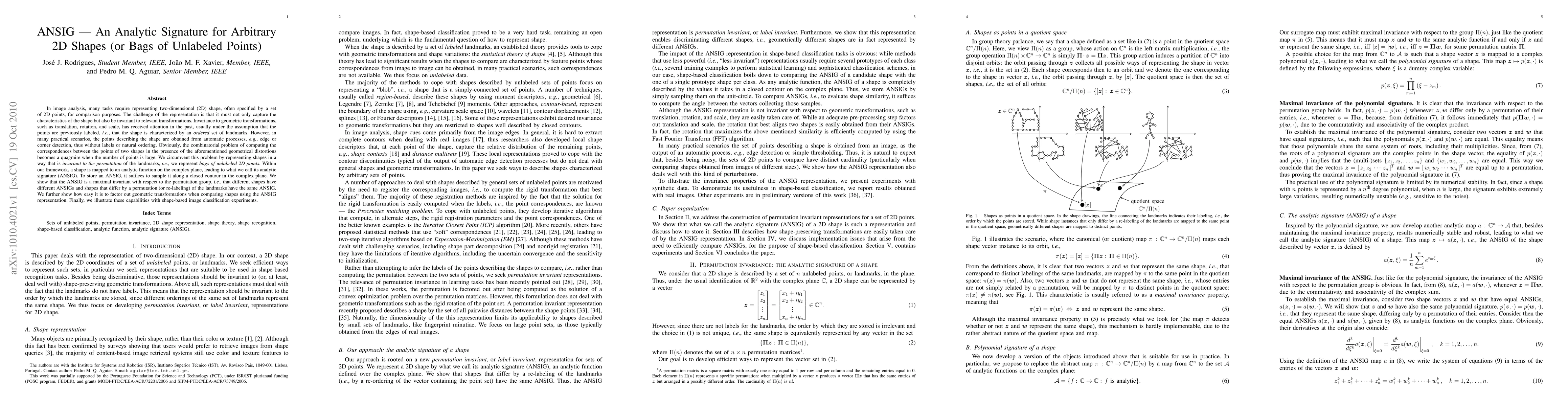 In image analysis, many tasks require representing two-dimensional (2D) shape, often specified by a set of 2D points, for comparison purposes. The challenge of the representation is that it must not only capture the characteristics of the shape but also be invariant to relevant transformations. Invariance to geometric transformations, such as translation, rotation, and scale, has received attention in the past, usually under the assumption that the points are previously labeled, i.e., that the shape is characterized by an ordered set of landmarks. However, in many practical scenarios, the points describing the shape are obtained from automatic processes, e.g., edge or corner detection, thus without labels or natural ordering. Obviously, the combinatorial problem of computing the correspondences between the points of two shapes in the presence of the aforementioned geometrical distortions becomes a quagmire when the number of points is large. We circumvent this problem by representing shapes in a way that is invariant to the permutation of the landmarks, i.e., we represent bags of unlabeled 2D points. Within our framework, a shape is mapped to an analytic function on the complex plane, leading to what we call its analytic signature (ANSIG). To store an ANSIG, it suffices to sample it along a closed contour in the complex plane. We show that the ANSIG is a maximal invariant with respect to the permutation group, i.e., that different shapes have different ANSIGs and shapes that differ by a permutation (or re-labeling) of the landmarks have the same ANSIG. We further show how easy it is to factor out geometric transformations when comparing shapes using the ANSIG representation. Finally, we illustrate these capabilities with shape-based image classification experiments.