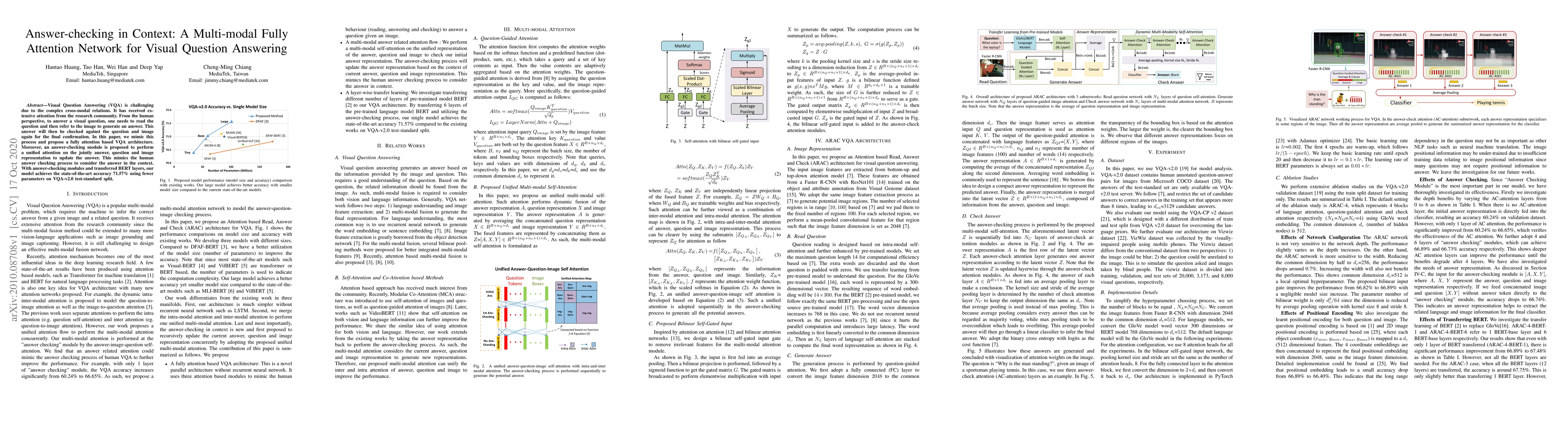 Visual Question Answering (VQA) is challenging due to the complex cross-modal relations. It has received extensive attention from the research community. From the human perspective, to answer a visual question, one needs to read the question and then refer to the image to generate an answer. This answer will then be checked against the question and image again for the final confirmation. In this paper, we mimic this process and propose a fully attention based VQA architecture. Moreover, an answer-checking module is proposed to perform a unified attention on the jointly answer, question and image representation to update the answer. This mimics the human answer checking process to consider the answer in the context. With answer-checking modules and transferred BERT layers, our model achieves the state-of-the-art accuracy 71.57\% using fewer parameters on VQA-v2.0 test-standard split.