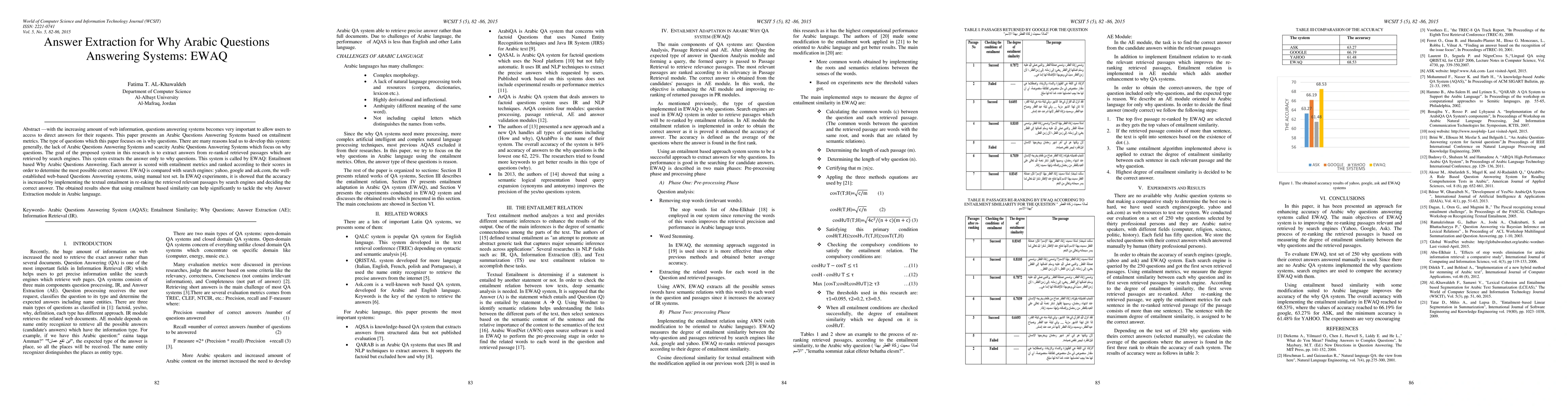 This paper introduces EWAQ, an entailment-based Arabic Questions Answering System specifically for why questions, addressing the scarcity of such systems in Arabic. EWAQ extracts and ranks answers from re-ranked passages using entailment metrics, showing improved accuracy compared to web-based QA systems.