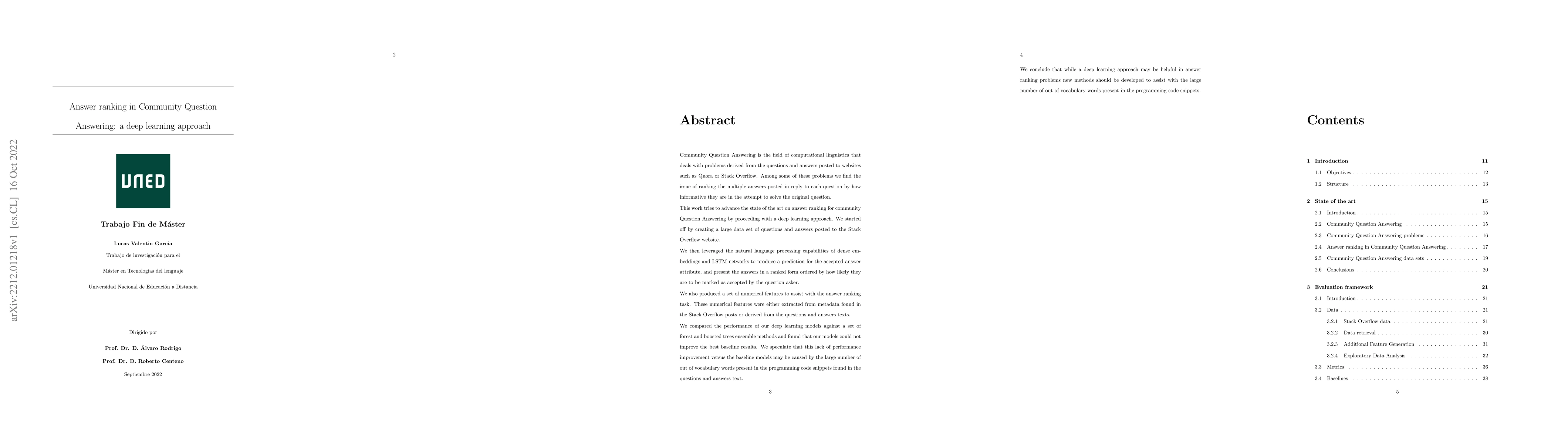 Community Question Answering is the field of computational linguistics that deals with problems derived from the questions and answers posted to websites such as Quora or Stack Overflow. Among some of these problems we find the issue of ranking the multiple answers posted in reply to each question by how informative they are in the attempt to solve the original question. This work tries to advance the state of the art on answer ranking for community Question Answering by proceeding with a deep learning approach. We started off by creating a large data set of questions and answers posted to the Stack Overflow website. We then leveraged the natural language processing capabilities of dense embeddings and LSTM networks to produce a prediction for the accepted answer attribute, and present the answers in a ranked form ordered by how likely they are to be marked as accepted by the question asker. We also produced a set of numerical features to assist with the answer ranking task. These numerical features were either extracted from metadata found in the Stack Overflow posts or derived from the questions and answers texts. We compared the performance of our deep learning models against a set of forest and boosted trees ensemble methods and found that our models could not improve the best baseline results. We speculate that this lack of performance improvement versus the baseline models may be caused by the large number of out of vocabulary words present in the programming code snippets found in the questions and answers text. We conclude that while a deep learning approach may be helpful in answer ranking problems new methods should be developed to assist with the large number of out of vocabulary words present in the programming code snippets