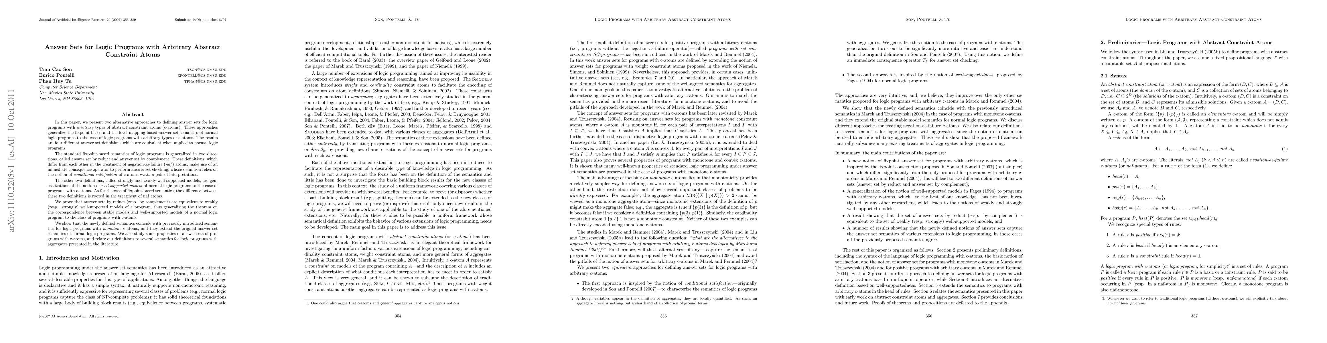 In this paper, we present two alternative approaches to defining answer sets for logic programs with arbitrary types of abstract constraint atoms (c-atoms). These approaches generalize the fixpoint-based and the level mapping based answer set semantics of normal logic programs to the case of logic programs with arbitrary types of c-atoms. The results are four different answer set definitions which are equivalent when applied to normal logic programs. The standard fixpoint-based semantics of logic programs is generalized in two directions, called answer set by reduct and answer set by complement. These definitions, which differ from each other in the treatment of negation-as-failure (naf) atoms, make use of an immediate consequence operator to perform answer set checking, whose definition relies on the notion of conditional satisfaction of c-atoms w.r.t. a pair of interpretations. The other two definitions, called strongly and weakly well-supported models, are generalizations of the notion of well-supported models of normal logic programs to the case of programs with c-atoms. As for the case of fixpoint-based semantics, the difference between these two definitions is rooted in the treatment of naf atoms. We prove that answer sets by reduct (resp. by complement) are equivalent to weakly (resp. strongly) well-supported models of a program, thus generalizing the theorem on the correspondence between stable models and well-supported models of a normal logic program to the class of programs with c-atoms. We show that the newly defined semantics coincide with previously introduced semantics for logic programs with monotone c-atoms, and they extend the original answer set semantics of normal logic programs. We also study some properties of answer sets of programs with c-atoms, and relate our definitions to several semantics for logic programs with aggregates presented in the literature.