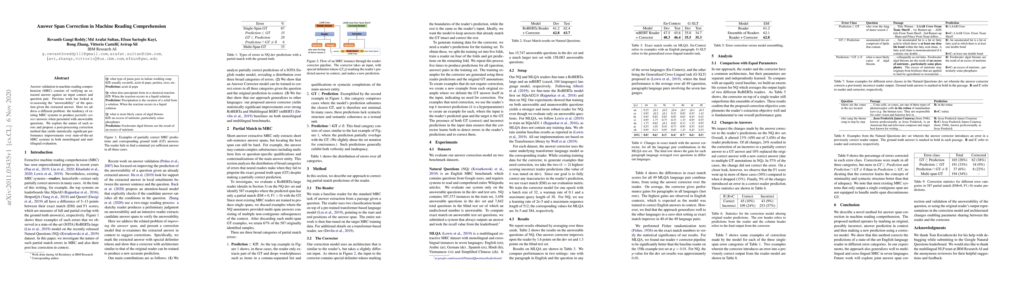 This paper investigates the issue of partially correct answers in machine reading comprehension systems and proposes a post-processing correction method that significantly improves performance over existing state-of-the-art systems in both monolingual and multilingual evaluations.