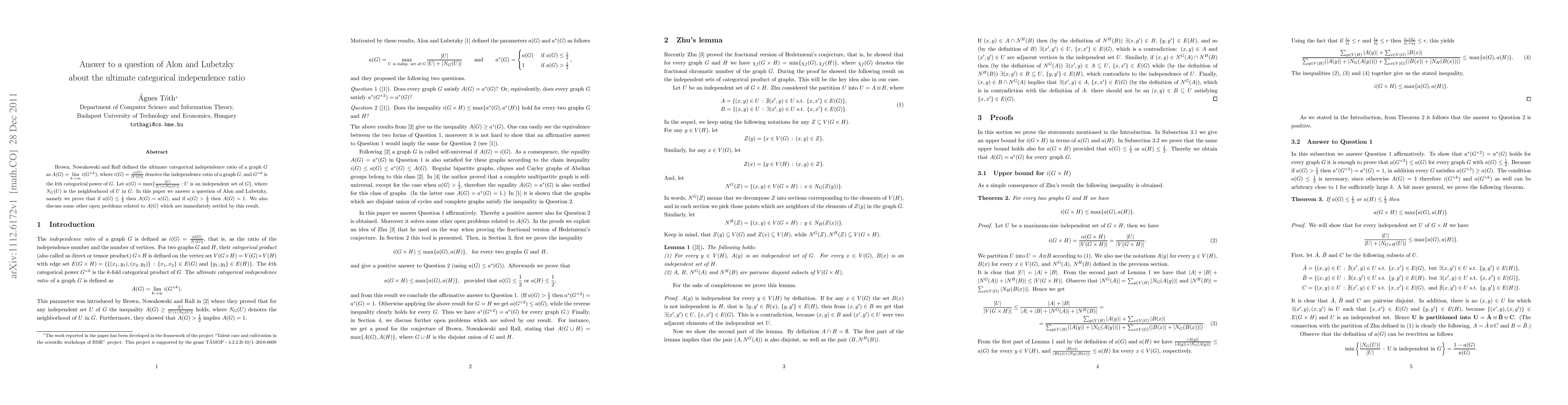 Researchers prove a new relationship between a graph's independence ratio and its ultimate categorical independence ratio, showing that if the independence ratio is less than or equal to 1/2, the two ratios are equal, and if greater than 1/2, they are opposite; this result settles several open problems in the field.
