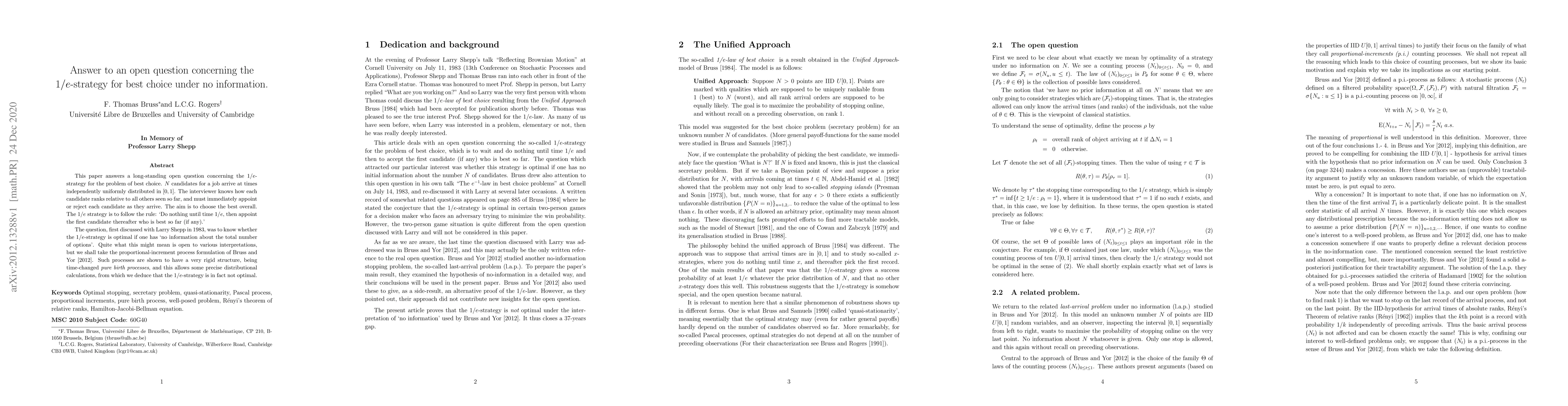 This paper answers a long-standing open question concerning the $1/e$-strategy for the problem of best choice. $N$ candidates for a job arrive at times independently uniformly distributed in $[0,1]$. The interviewer knows how each candidate ranks relative to all others seen so far, and must immediately appoint or reject each candidate as they arrive. The aim is to choose the best overall. The $1/e$ strategy is to follow the rule: `Do nothing until time $1/e$, then appoint the first candidate thereafter who is best so far (if any).' The question, first discussed with Larry Shepp in 1983, was to know whether the $1/e$-strategy is optimal if one has `no information about the total number of options'. Quite what this might mean is open to various interpretations, but we shall take the proportional-increment process formulation of \cite{BY}. Such processes are shown to have a very rigid structure, being time-changed {\em pure birth processes}, and this allows some precise distributional calculations, from which we deduce that the $1/e$-strategy is in fact not optimal.