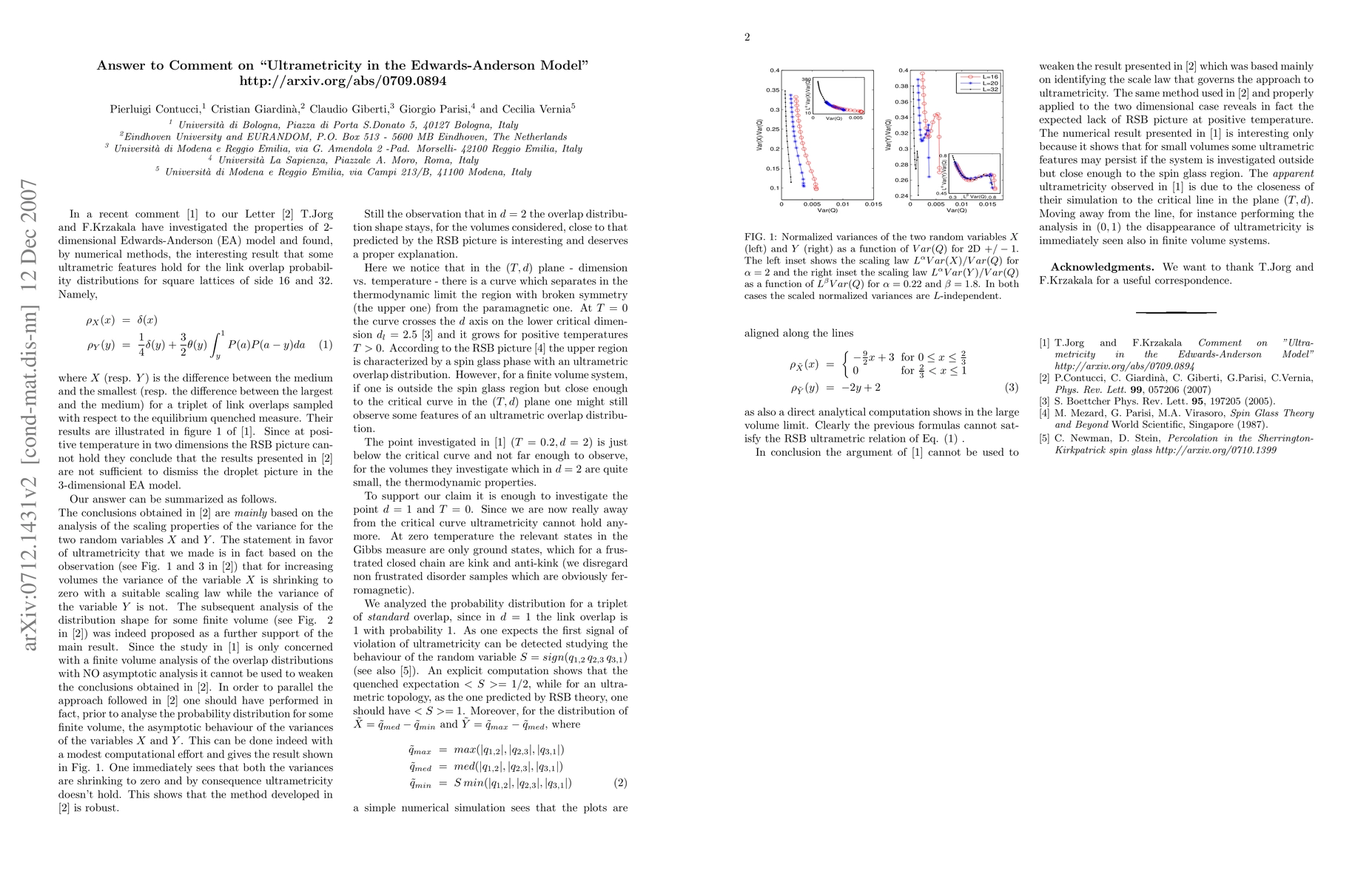 This reply shows that the argument presented in the comment by Jorg and Krzakala (cond mat 0709.0894) cannot be used to weaken the results presented in our paper on ultrametricity evidence in the 3d Edwards Anderson model (PRL 99, 057206, 2007; cond-mat/0607376). Our work in fact was mainly based on identifying the scaling law that governs the large volume approach to ultrametricity while NO asymptotic analysis has been done in (cond mat 0709.0894). We show here that the same method we used in our paper, when properly applied to the 2d case, reveals the expected lack of RSB picture at positive temperature, despite the fact that for a fixed finite volume some ultrametric features might still be seen in the joint overlap probability distribution. Those features disappear for increasing volume or when the system is away from the critical curve in the (T,d) plane.