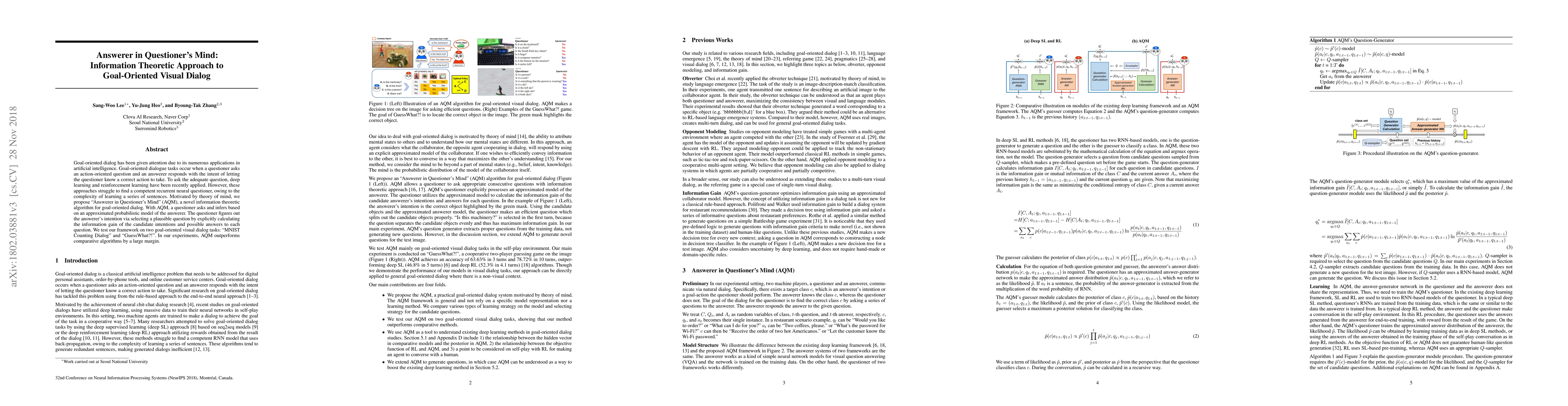 This paper proposes "Answerer in Questioner's Mind" (AQM), an information theoretic algorithm for goal-oriented visual dialog, which outperforms existing methods by leveraging an approximated probabilistic model of the answerer to maximize information gain. Experiments on "MNIST Counting Dialog" and "GuessWhat?!" demonstrate its effectiveness.