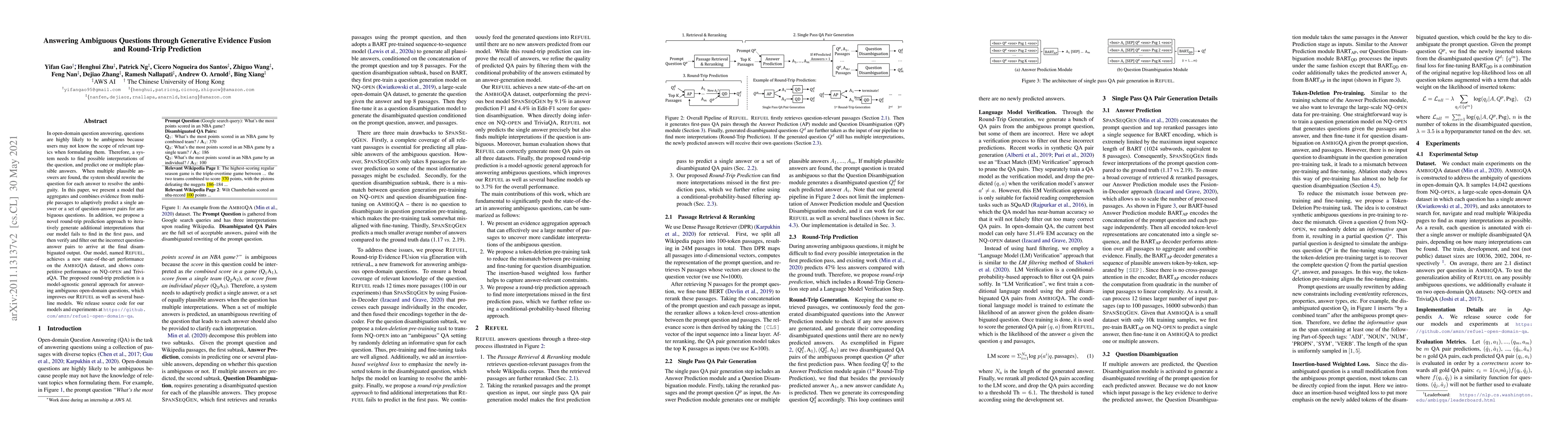 This paper introduces Refuel, a model that uses generative evidence fusion and round-trip prediction to answer ambiguous questions. It achieves state-of-the-art performance on AmbigQA and competitive results on NQ-Open and TriviaQA by iteratively refining interpretations and filtering incorrect answers.