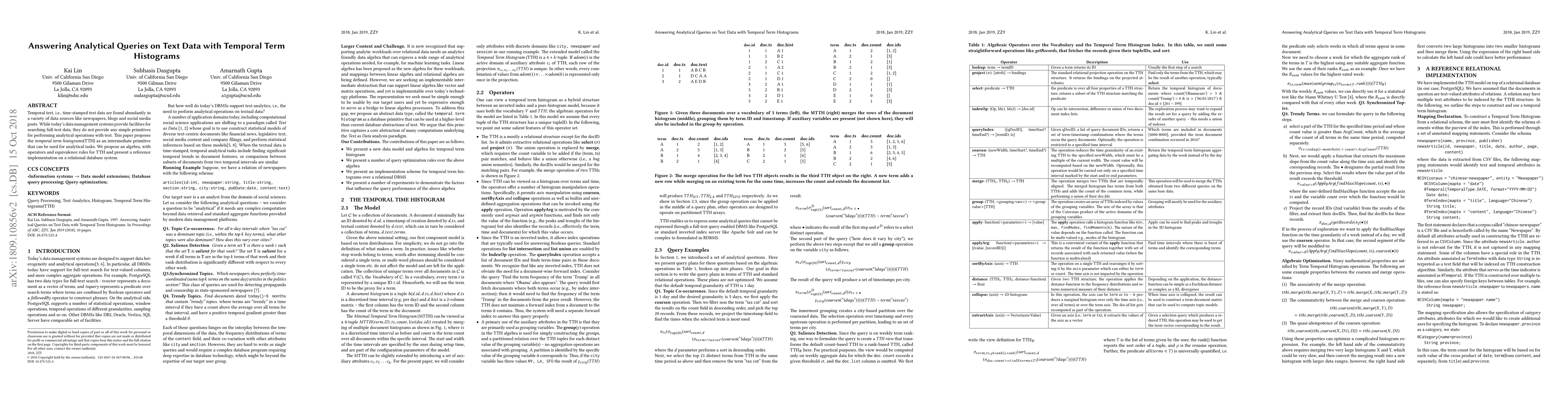 Temporal text, i.e., time-stamped text data are found abundantly in a variety of data sources like newspapers, blogs and social media posts. While today's data management systems provide facilities for searching full-text data, they do not provide any simple primitives for performing analytical operations with text. This paper proposes the temporal term histograms (TTH) as an intermediate primitive that can be used for analytical tasks. We propose an algebra, with operators and equivalence rules for TTH and present a reference implementation on a relational database system.