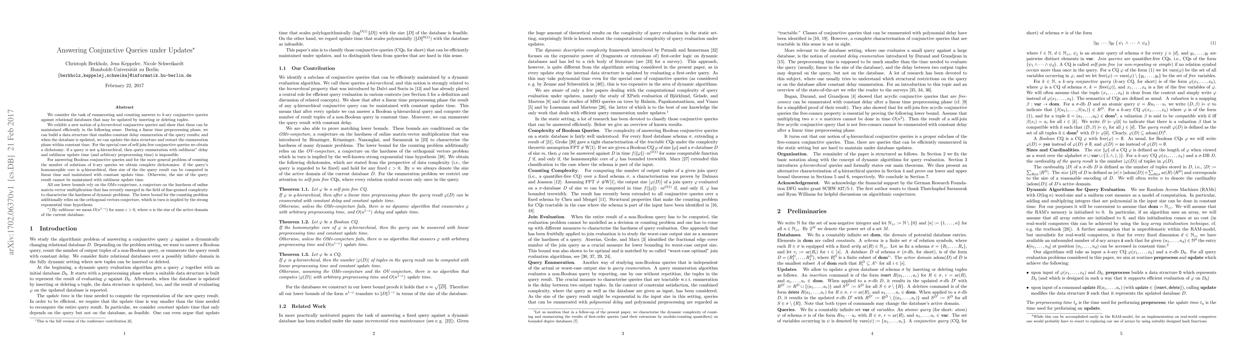 This paper introduces a new class of q-hierarchical conjunctive queries that can be efficiently maintained under database updates, enabling constant delay enumeration and sublinear update time. It establishes dichotomies for answering Boolean queries and counting query results, contingent on the q-hierarchical nature of the query's core, and supports these findings with lower bounds based on the OMv-conjecture and the orthogonal vectors conjecture.