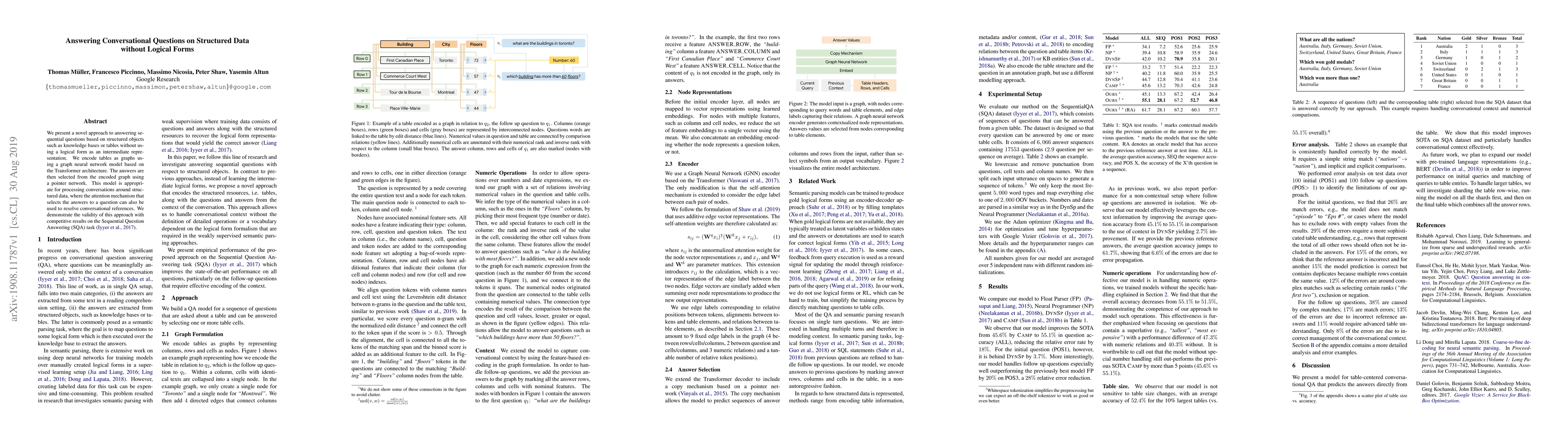 This paper introduces a method for answering conversational questions on structured data using graph neural networks and pointer networks, bypassing the need for logical forms. The approach demonstrates competitive results on the Sequential Question Answering task.