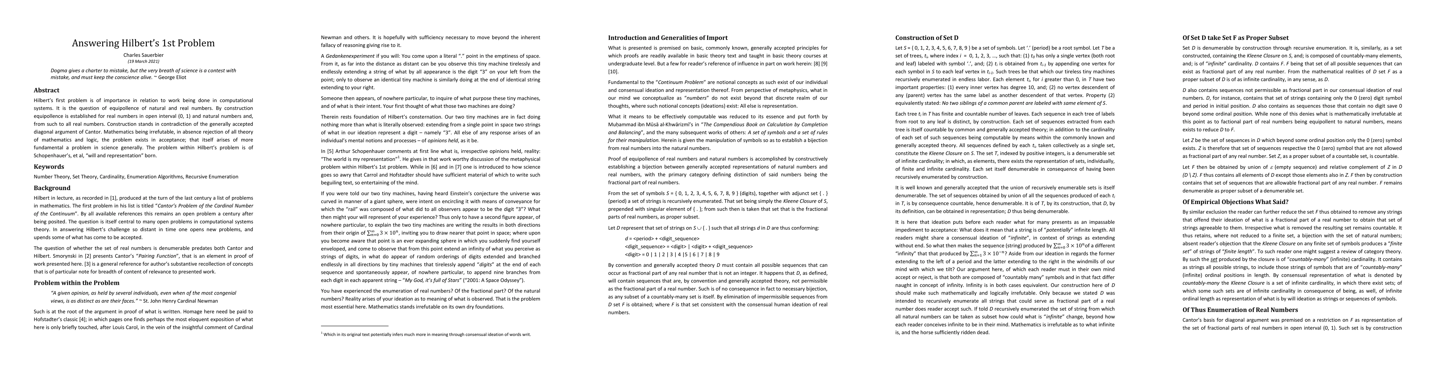 Hilbert's first problem is of importance in relation to work being done in computational systems. It is the question of equipollence of natural and real numbers. By construction equipollence is established for real numbers in open interval (0, 1) and natural numbers and, from such to all real numbers. Construction stands in contradiction of the generally accepted diagonal argument of Cantor. Mathematics being irrefutable, in absence rejection of all theory of mathematics and logic, the problem exists in acceptance; that itself arises of more fundamental a problem in science generally. The problem within Hilbert's problem is of Schopenhauer's, et al, "will and representation" born.