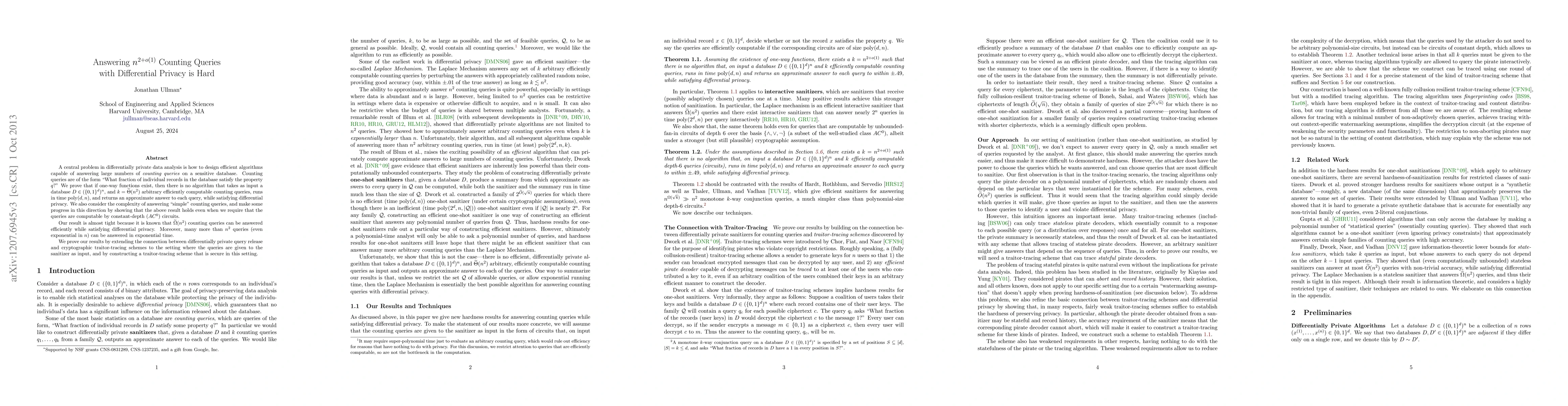 This paper proves that answering n^{2+o(1)} counting queries under differential privacy is computationally infeasible unless one-way functions do not exist. The authors show that even simple counting queries computable by constant depth circuits cannot be efficiently answered while maintaining differential privacy.
