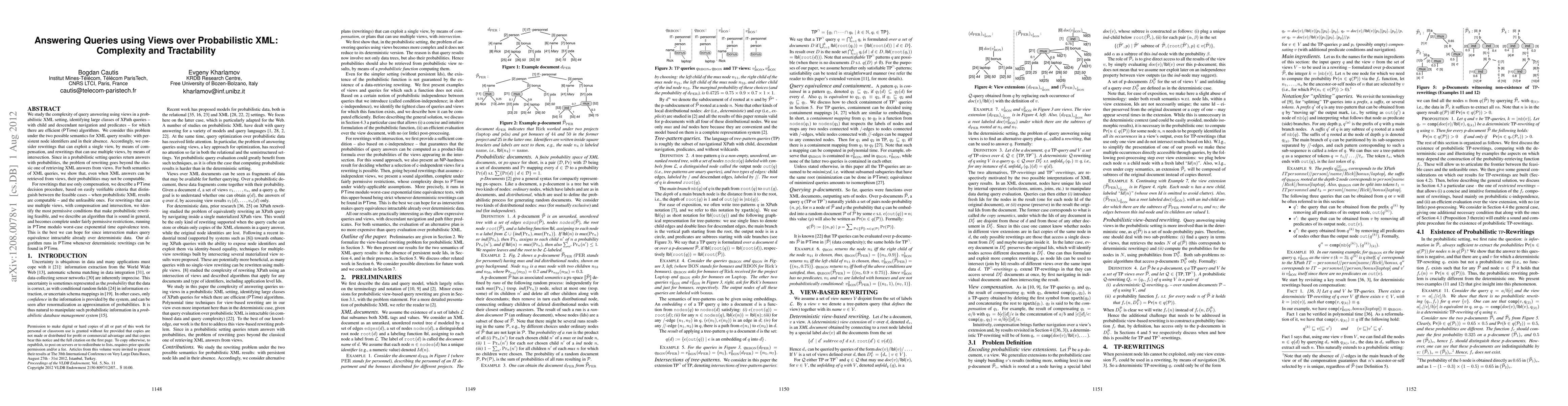This paper investigates the complexity of query answering using views in probabilistic XML, identifying efficient algorithms for various XPath queries under different XML query result semantics. It presents a PTime decision procedure for single-view rewritings and a PTime algorithm for multiple-view rewritings, highlighting the challenges in computing probabilities for XML query results.