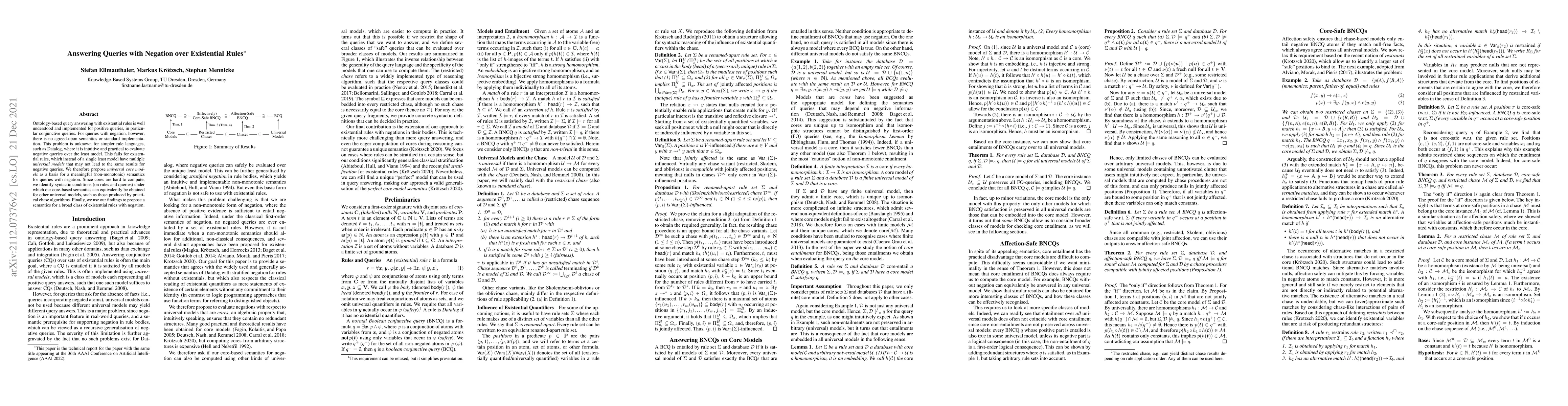 Ontology-based query answering with existential rules is well understood and implemented for positive queries, in particular conjunctive queries. The situation changes drastically for queries with negation, where there is no agreed-upon semantics or standard implementation. Stratification, as used for Datalog, is not enough for existential rules, since the latter still admit multiple universal models that can differ on negative queries. We therefore propose universal core models as a basis for a meaningful (non-monotonic) semantics for queries with negation. Since cores are hard to compute, we identify syntactic descriptions of queries that can equivalently be answered over other types of models. This leads to fragments of queries with negation that can safely be evaluated by current chase implementations. We establish new techniques to estimate how the core model differs from other universal models, and we incorporate our findings into a new reasoning approach for existential rules with negation.