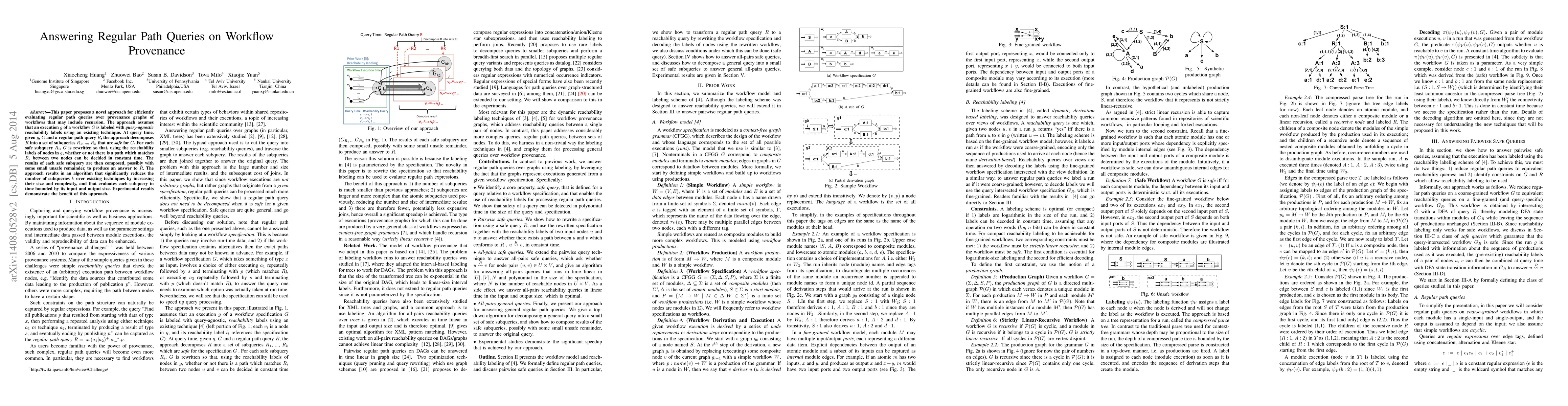 This paper introduces a method for efficiently evaluating regular path queries on workflow provenance graphs, including recursive structures, by decomposing queries into manageable subqueries and leveraging reachability labels for constant-time path matching. The proposed algorithm significantly reduces query complexity compared to existing techniques.