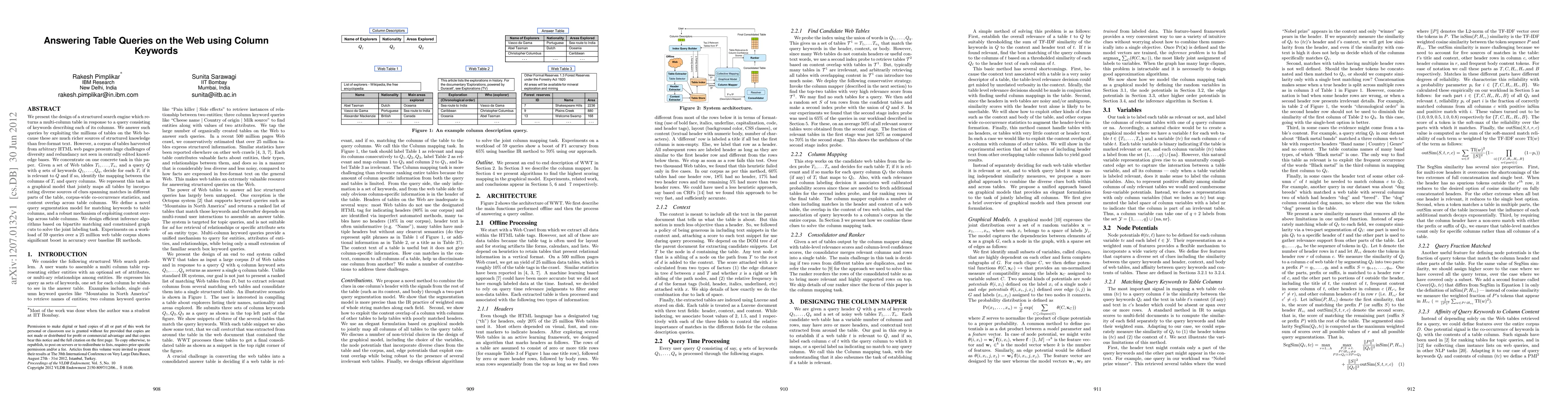 This paper designs a structured search engine to answer multi-column table queries using column keywords, leveraging web tables for richer structured knowledge. It introduces a graphical model to map web tables to query keywords, employing content overlap and co-occurrence statistics, and demonstrates improved accuracy over baseline methods in experiments.