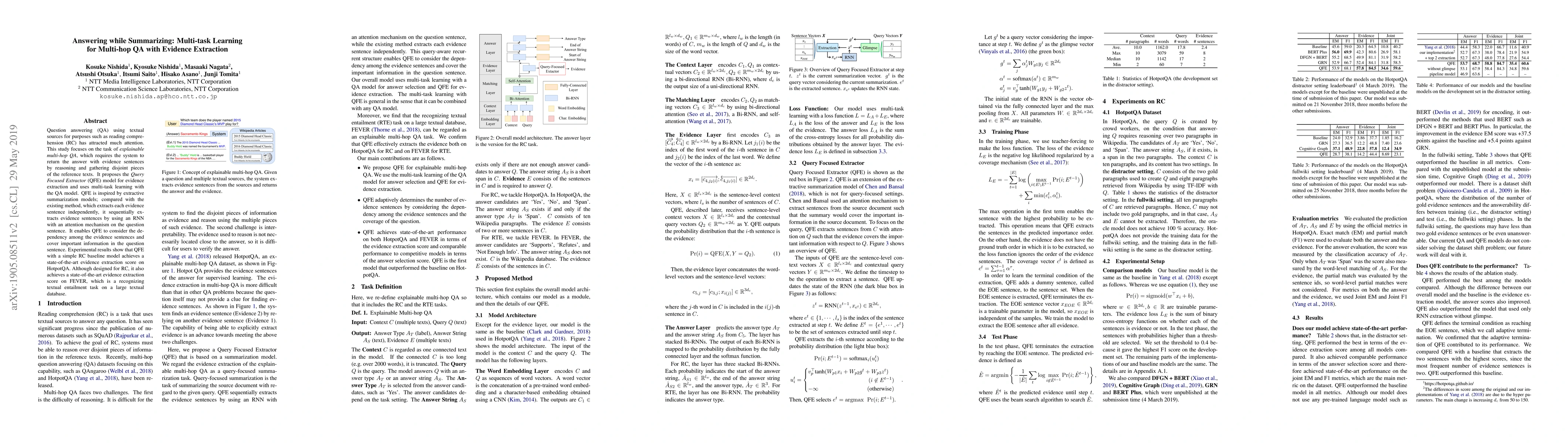Question answering (QA) using textual sources for purposes such as reading comprehension (RC) has attracted much attention. This study focuses on the task of explainable multi-hop QA, which requires the system to return the answer with evidence sentences by reasoning and gathering disjoint pieces of the reference texts. It proposes the Query Focused Extractor (QFE) model for evidence extraction and uses multi-task learning with the QA model. QFE is inspired by extractive summarization models; compared with the existing method, which extracts each evidence sentence independently, it sequentially extracts evidence sentences by using an RNN with an attention mechanism on the question sentence. It enables QFE to consider the dependency among the evidence sentences and cover important information in the question sentence. Experimental results show that QFE with a simple RC baseline model achieves a state-of-the-art evidence extraction score on HotpotQA. Although designed for RC, it also achieves a state-of-the-art evidence extraction score on FEVER, which is a recognizing textual entailment task on a large textual database.