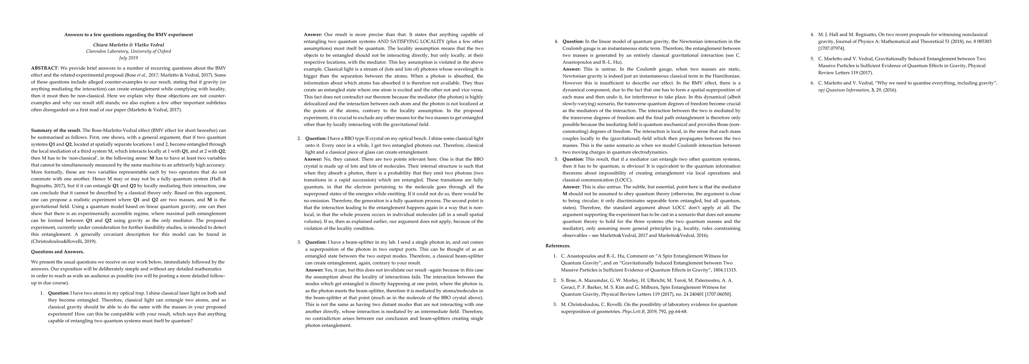Researchers address common misconceptions about their 2017 experiment on the BMV effect, which explores the intersection of gravity and entanglement. They reaffirm that the experiment's results do not imply non-classical behavior.