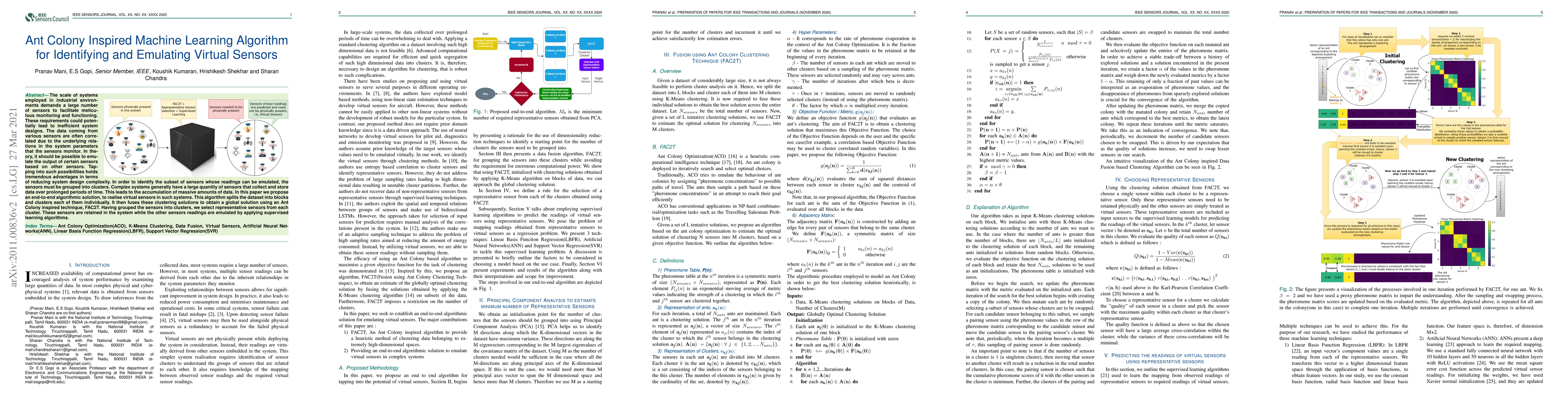 The scale of systems employed in industrial environments demands a large number of sensors to facilitate meticulous monitoring and functioning. These requirements could potentially lead to inefficient system designs. The data coming from various sensors are often correlated due to the underlying relations in the system parameters that the sensors monitor. In theory, it should be possible to emulate the output of certain sensors based on other sensors. Tapping into such possibilities holds tremendous advantages in terms of reducing system design complexity. In order to identify the subset of sensors whose readings can be emulated, the sensors must be grouped into clusters. Complex systems generally have a large quantity of sensors that collect and store data over prolonged periods of time. This leads to the accumulation of massive amounts of data. In this paper we propose an end-to-end algorithmic solution, to realise virtual sensors in such systems. This algorithm splits the dataset into blocks and clusters each of them individually. It then fuses these clustering solutions to obtain a global solution using an Ant Colony inspired technique, FAC2T. Having grouped the sensors into clusters, we select representative sensors from each cluster. These sensors are retained in the system while the other sensors readings are emulated by applying supervised learning algorithms.