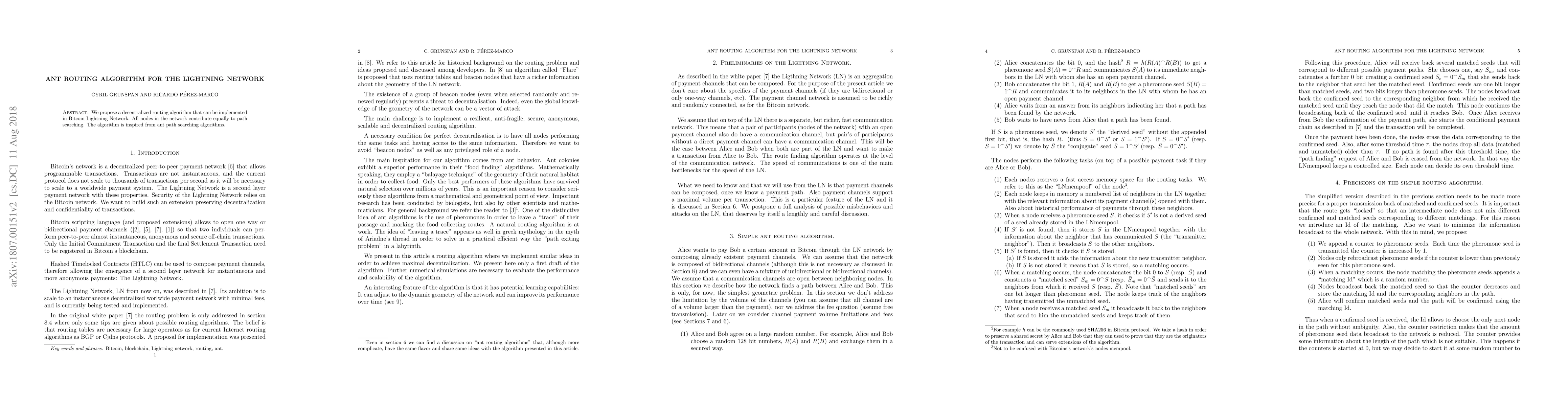 Summary: This paper introduces a decentralized routing algorithm for the Bitcoin Lightning Network, inspired by ant colony path-finding behavior, where all nodes equally contribute to path discovery. The proposed algorithm aims to enhance the efficiency and decentralization of the network.