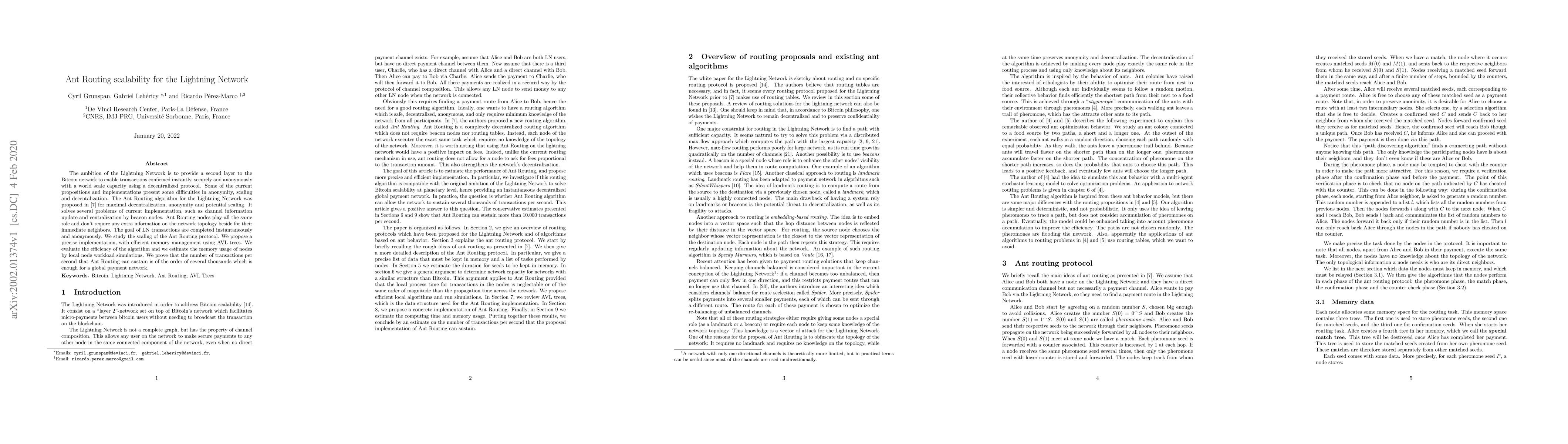 The Ant Routing algorithm aims to enhance the Lightning Network's scalability, decentralization, and anonymity. Through efficient memory management and simulations, it demonstrates the potential to sustain thousands of transactions per second, sufficient for a global payment network.
