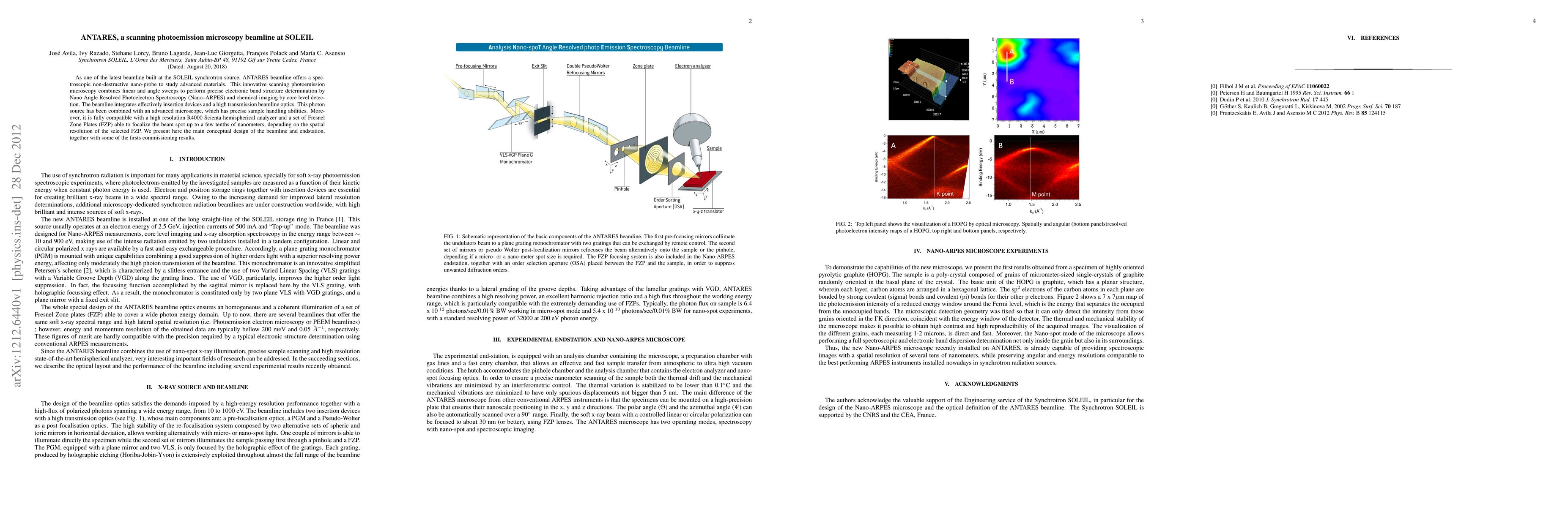 The ANTARES beamline at SOLEIL synchrotron source provides a non-destructive nano-probe for advanced material studies through scanning photoemission microscopy, combining nanoARPES and core level detection for electronic band structure and chemical imaging. The beamline features high-resolution microscopy and Fresnel Zone Plates for sub-nanometer beam spot focalization.