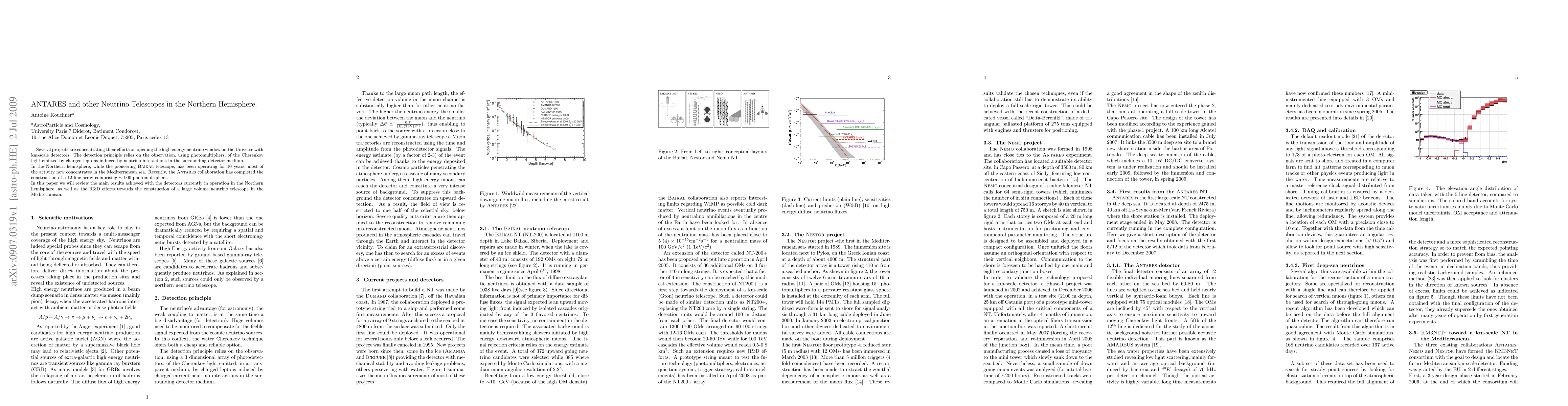 Several projects are concentrating their efforts on opening the high energy neutrino window on the Universe with km-scale detectors. The detection principle relies on the observation, using photomultipliers, of the Cherenkov light emitted by charged leptons induced by neutrino interactions in the surrounding detector medium. In the Northern hemisphere, while the pioneering Baikal telescope, has been operating for 10 years, most of the activity now concentrates in the Mediterranean sea. Recently, the Antares collaboration has completed the construction of a 12 line array comprising ~ 900 photomultipliers. In this paper we will review the main results achieved with the detectors currently in operation in the Northern hemisphere, as well as the R&D efforts towards the construction of a large volume neutrino telescope in the Mediterranean.