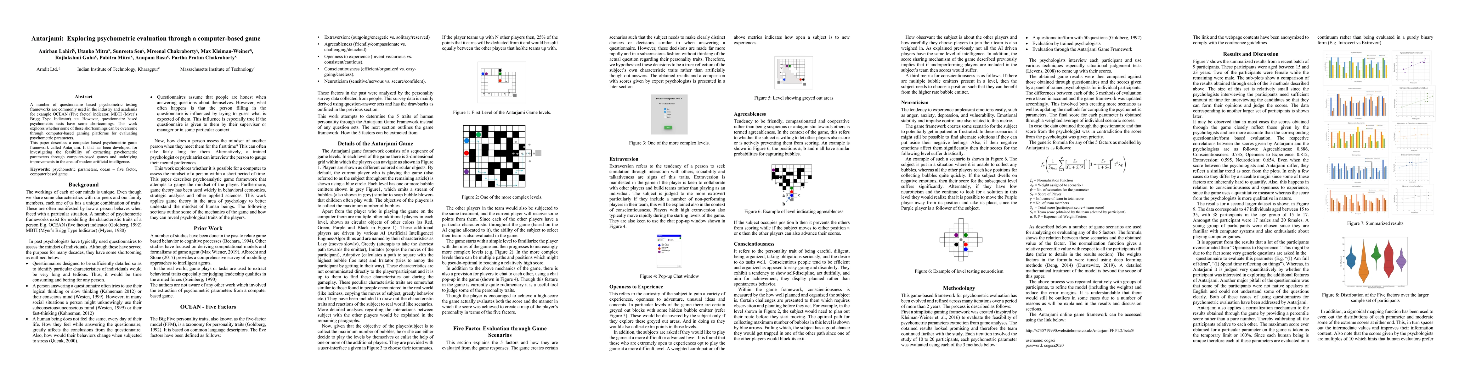 A number of questionnaire based psychometric testing frameworks are globally for example OCEAN (Five factor) indicator, MBTI (Myers Brigg Type Indicator) etc. However, questionnaire based psychometric tests have some known shortcomings. This work explores whether these shortcomings can be mitigated through computer-based gaming platforms for evaluating psychometric parameters. A computer based psychometric game framework called Antarjami has been developed for evaluating OCEAN (Five factor) indicators. It investigates the feasibility of extracting psychometric parameters through computer-based games, utilizing underlying improvements in the area of modern artificial intelligence. The candidates for the test are subjected to a number scenarios as part of the computer based game and their reactions/responses are used to evaluate their psychometric parameters. As part of the study, the parameters obtained from the game were compared with those evaluated using paper based tests and scores given by a panel of psychologists. The achieved results were very promising.
