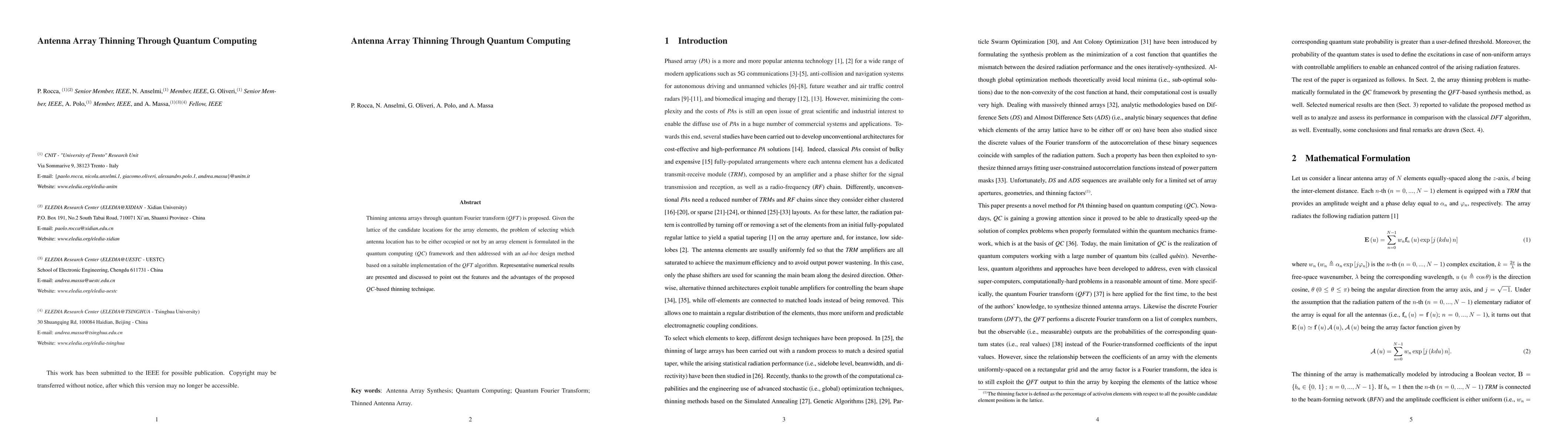 This paper proposes a quantum computing-based method using the quantum Fourier transform to thin antenna arrays by determining which antenna locations should be occupied. The technique demonstrates advantages over traditional methods through representative numerical results.