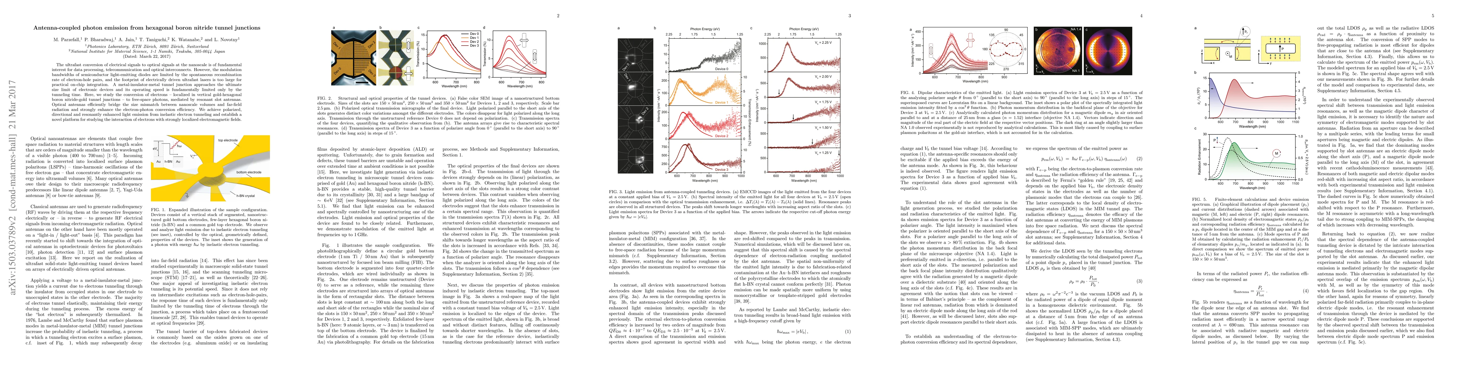 This research presents a novel method for converting electrical signals into optical signals at the nanoscale using gold-h-BN-gold tunnel junctions and resonant slot antennas. The approach surpasses limitations of semiconductor LEDs and bulky lasers, demonstrating polarized, directional, and enhanced light emission from inelastic electron tunneling. This paves the way for the development of miniature light sources combining nanoelectronics and nanophotonics.