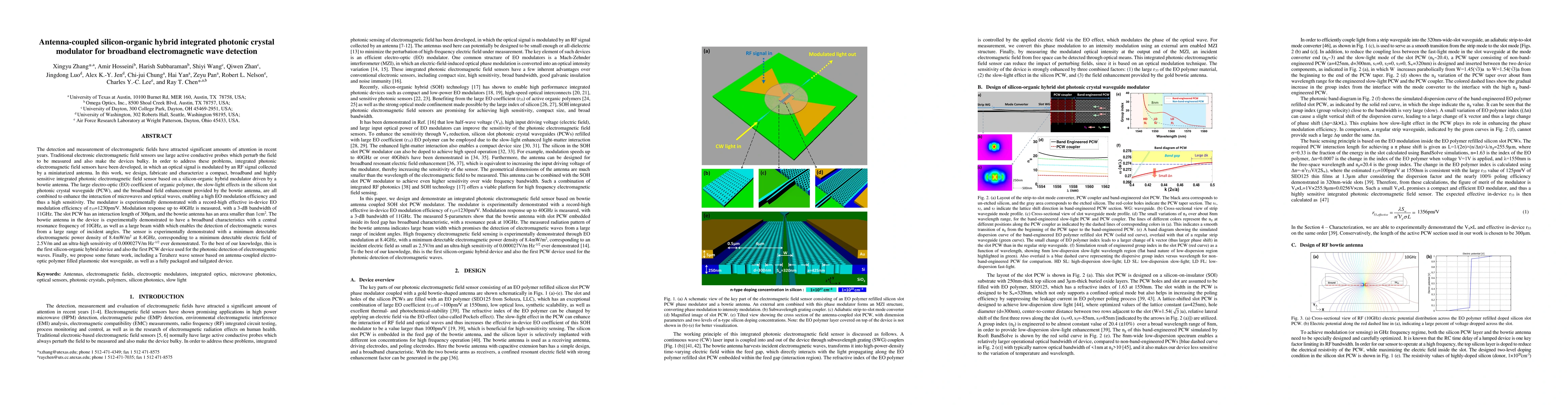 This research develops a compact, broadband electromagnetic wave detector using a silicon-organic hybrid photonic crystal modulator driven by a bowtie antenna, achieving record-high sensitivity with a modulation efficiency of 1230 pm/V and a minimum detectable electric field of 2.5 V/m. The design combines organic polymer's electro-optic properties, slow-light effects in silicon waveguides, and antenna-coupled broadband enhancement.