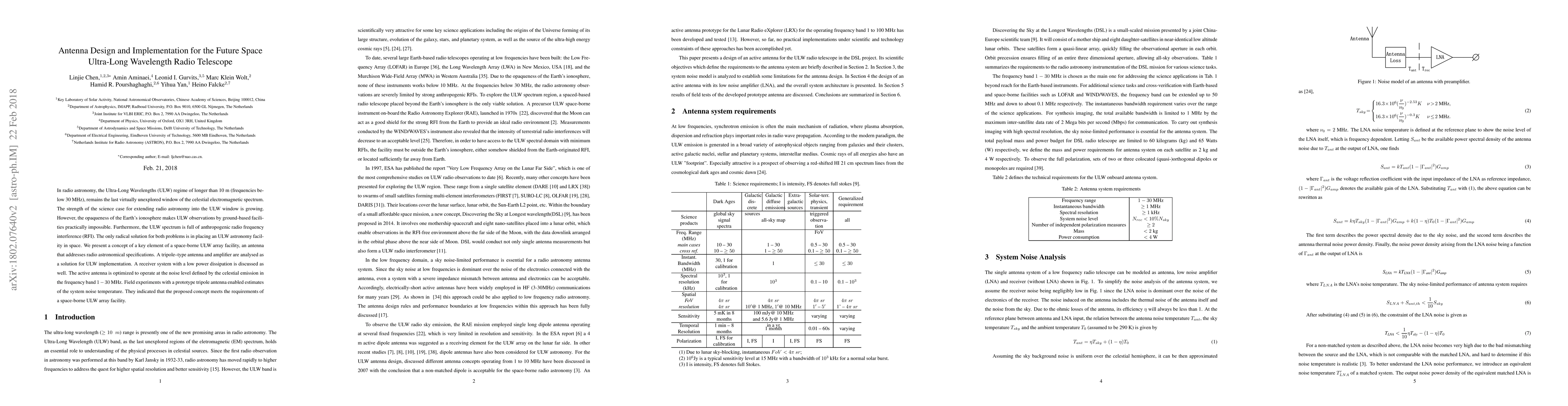 This paper proposes a tripole-type antenna and amplifier for a space-borne Ultra-Long Wavelength (ULW) radio telescope, designed to operate in the 1-30 MHz frequency band. Field experiments with a prototype demonstrated that the system noise temperature meets the requirements for ULW astronomy, addressing the challenges posed by the Earth's ionosphere and RFI.