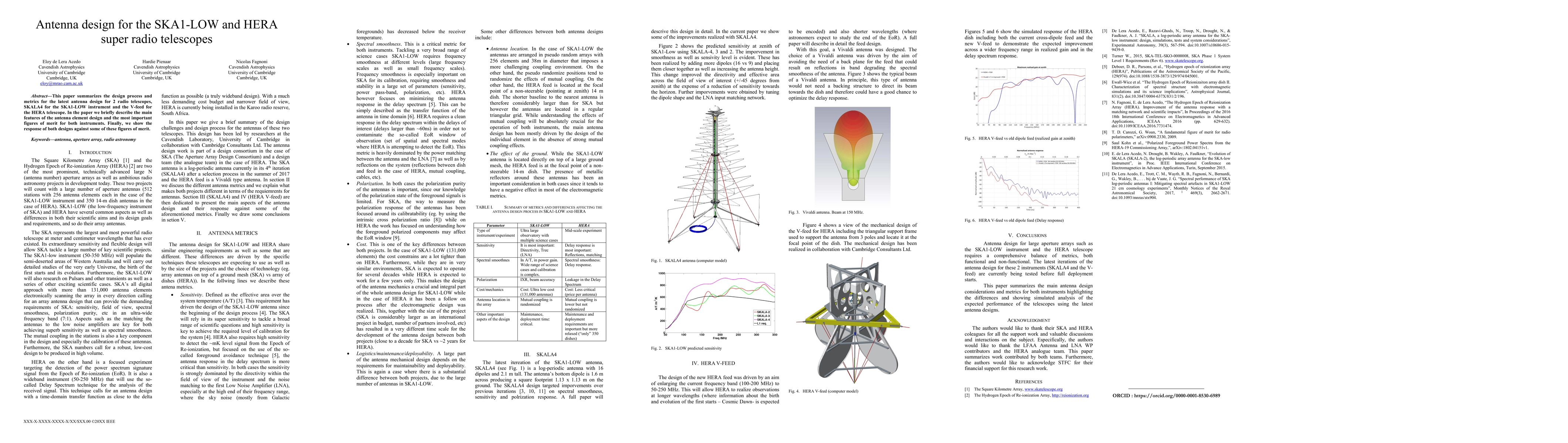 This paper outlines the design and evaluation metrics for the antennas of the SKA1-LOW and HERA radio telescopes, focusing on the V-feed and SKALA4 elements, and assesses their performance against key figures of merit. The study highlights the main features and responses of both antenna designs.