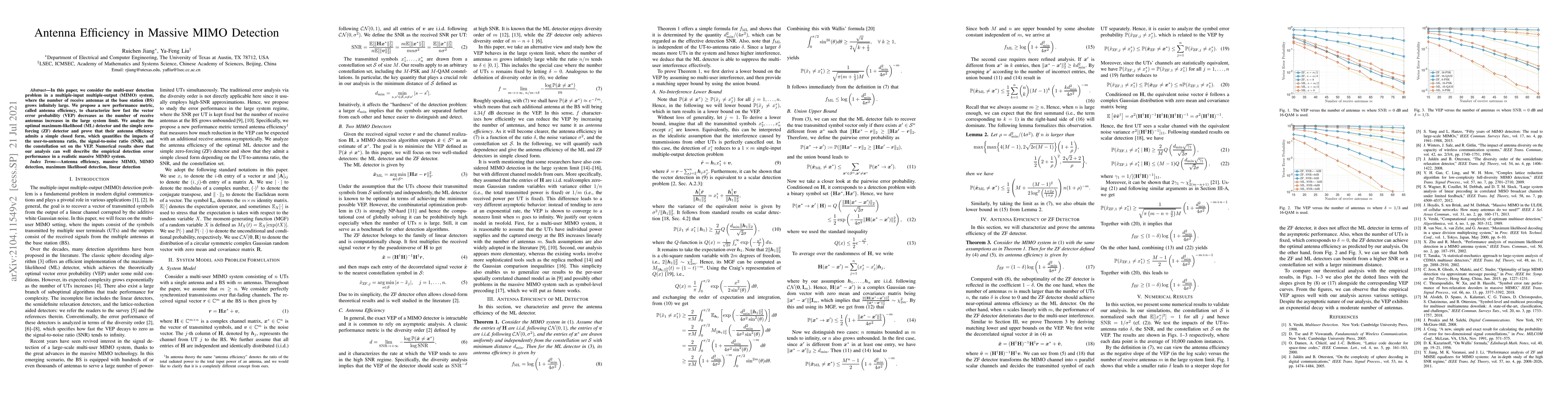 In this paper, we consider the multi-user detection problem in a multiple-input multiple-output (MIMO) system, where the number of receive antennas at the base station (BS) grows infinitely large. We propose a new performance metric, called antenna efficiency, to characterize how fast the vector error probability (VEP) decreases as the number of receive antennas increases in the large system limit. We analyze the optimal maximum-likelihood (ML) detector and the simple zero-forcing (ZF) detector and prove that their antenna efficiency admits a simple closed form, which quantifies the impacts of the user-to-antenna ratio, the signal-to-noise ratio (SNR), and the constellation set on the VEP. Numerical results show that our analysis can well describe the empirical detection error performance in a realistic massive MIMO system.