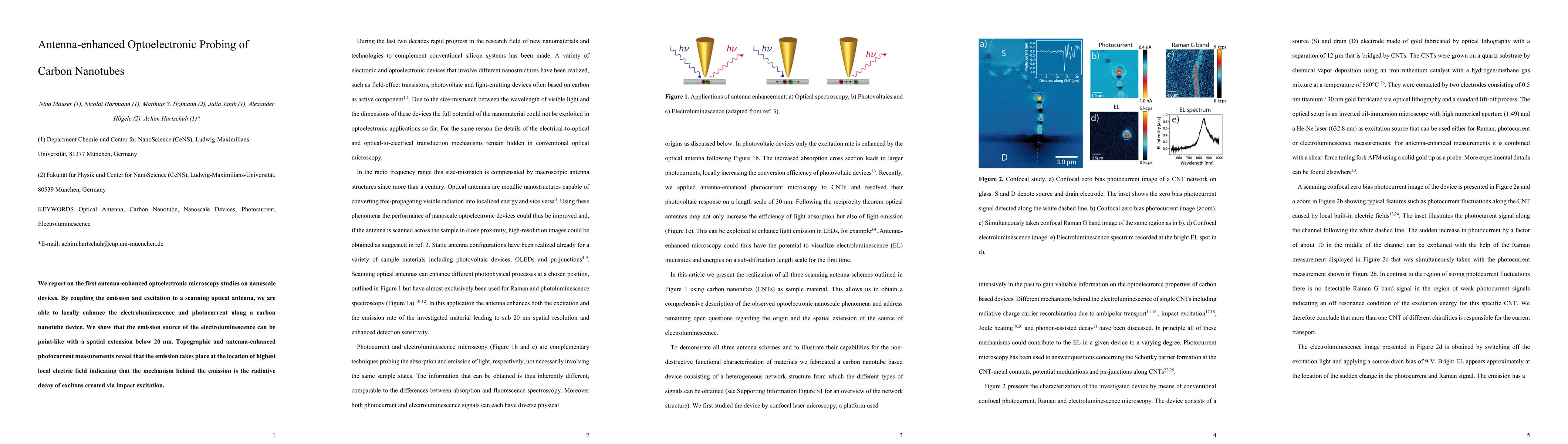 We report on the first antenna-enhanced optoelectronic microscopy studies on nanoscale devices. By coupling the emission and excitation to a scanning optical antenna, we are able to locally enhance the electroluminescence and photocurrent along a carbon nanotube device. We show that the emission source of the electroluminescence can be point-like with a spatial extension below 20 nm. Topographic and antenna-enhanced photocurrent measurements reveal that the emission takes place at the location of highest local electric field indicating that the mechanism behind the emission is the radiative decay of excitons created via impact excitation.