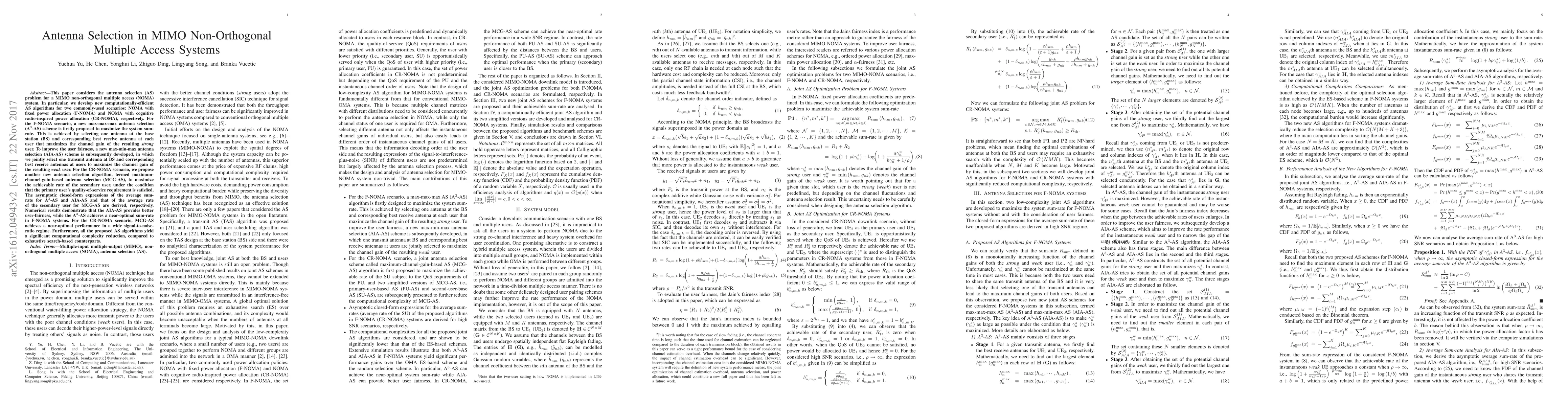 The proposed algorithms offer a significant improvement over existing solutions for joint antenna selection in MIMO non-orthogonal multiple access systems.