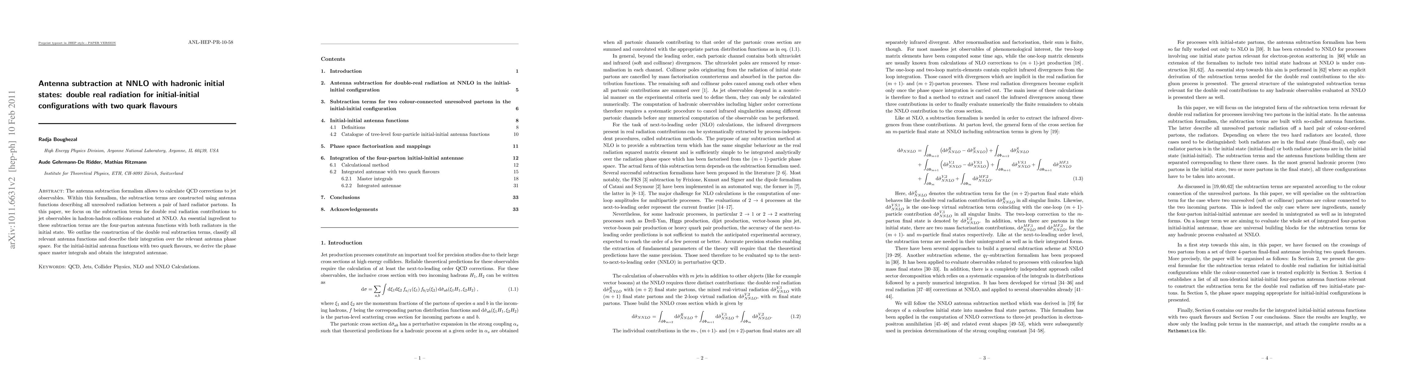 This paper develops the antenna subtraction formalism for calculating QCD corrections at NNLO in hadron-hadron collisions, focusing on double real radiation contributions from initial-initial configurations with two quark flavours. It derives the phase space master integrals for the relevant four-parton antenna functions and describes their integration.