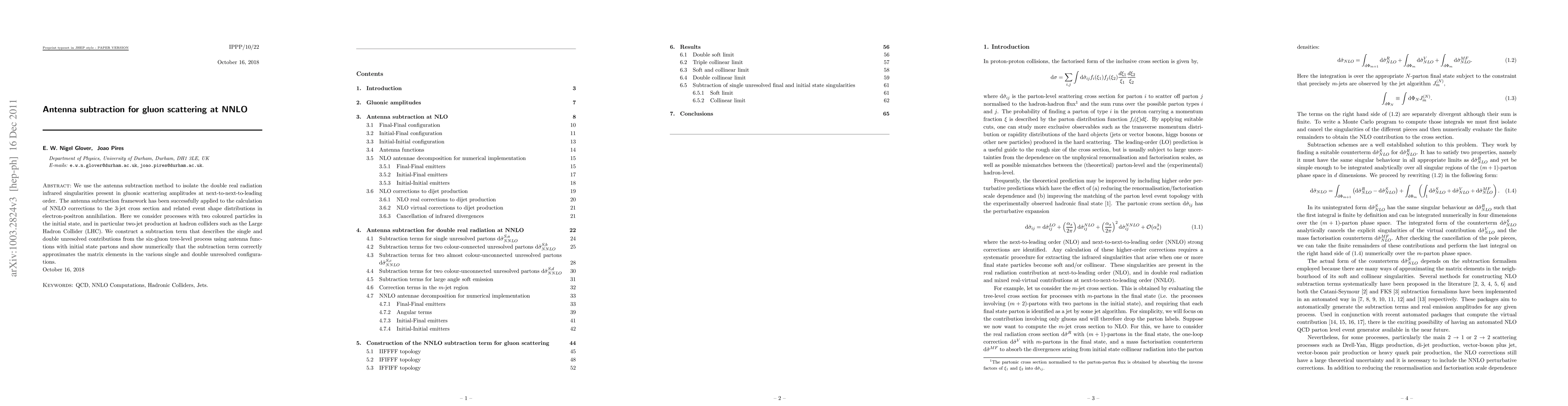This paper applies the antenna subtraction method to isolate infrared singularities in gluon scattering amplitudes at next-to-next-to-leading order, focusing on two-jet production at hadron colliders like the LHC. The constructed subtraction term accurately approximates the matrix elements for single and double unresolved configurations.