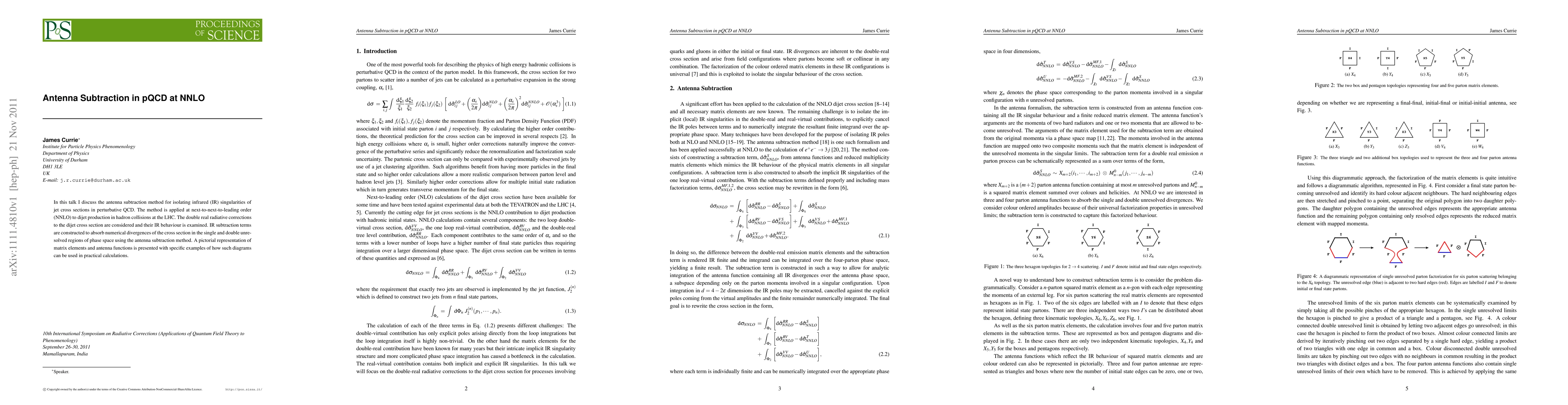 This paper presents the antenna subtraction method for managing infrared singularities in perturbative QCD at NNLO, specifically applied to dijet production in LHC collisions. It constructs IR subtraction terms to handle divergences in unresolved phase space regions and provides visual examples of matrix elements and antenna functions for practical calculations.