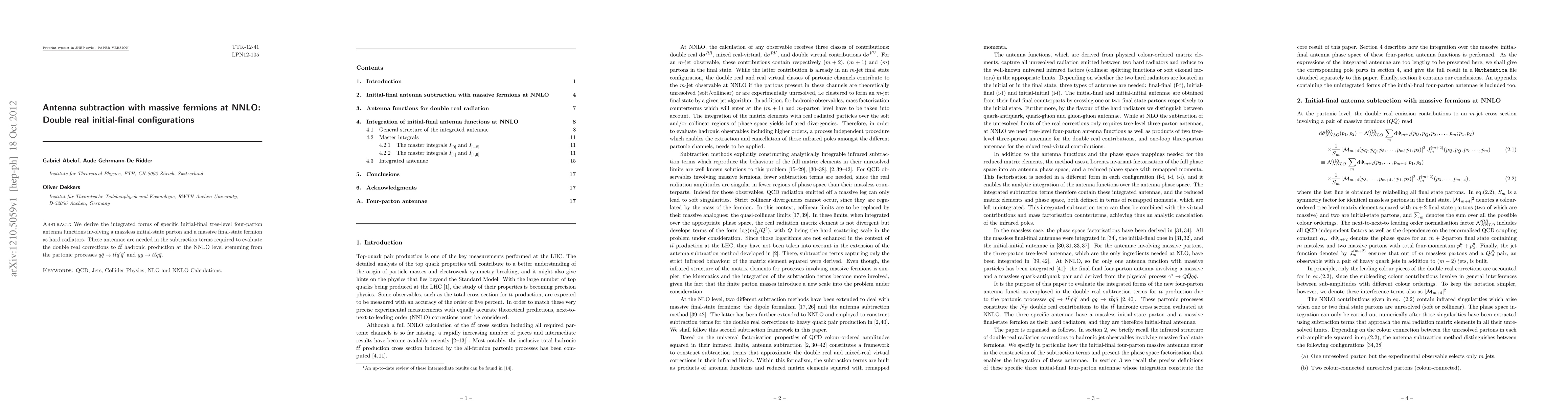 This paper derives integrated forms of antenna functions for double real corrections in $t\bar{t}$ production involving a massless initial-state parton and a massive final-state fermion, essential for NNLO calculations in the processes $q\bar{q}\to t\bar{t}q'\bar{q}'$ and $gg\to t\bar{t}q\bar{q}$. These antennae are crucial for the subtraction terms in the evaluation.