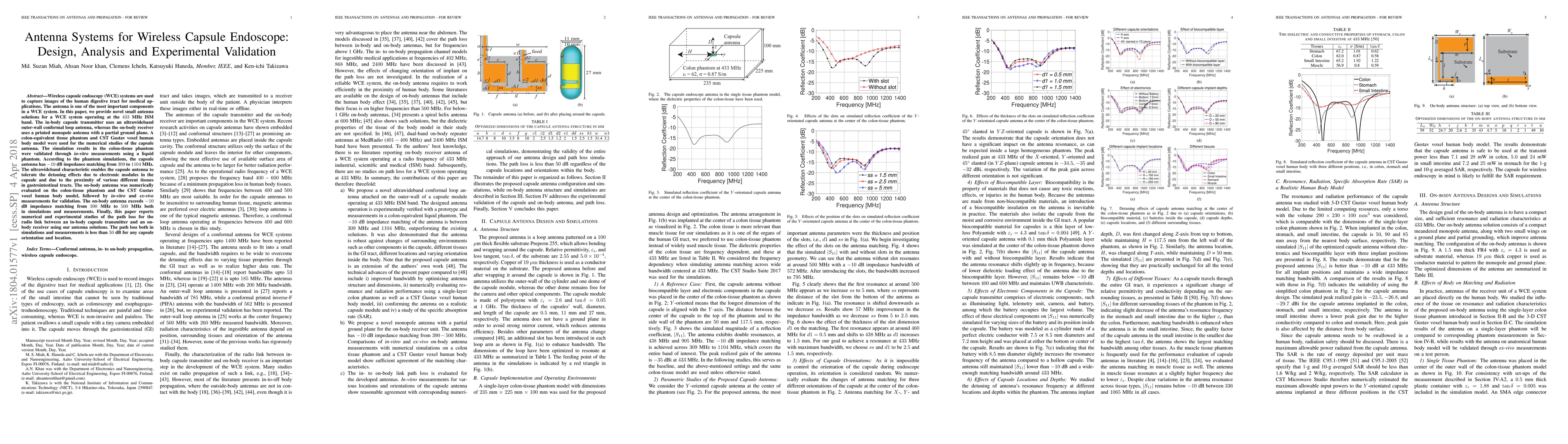 This paper presents novel small antenna designs for wireless capsule endoscopy systems operating at 433 MHz, including an ultrawideband conformal loop antenna for the capsule and a printed monopole antenna for the receiver. Both antennas were validated through simulations and in-vitro measurements, demonstrating effective impedance matching and low path loss for reliable communication.