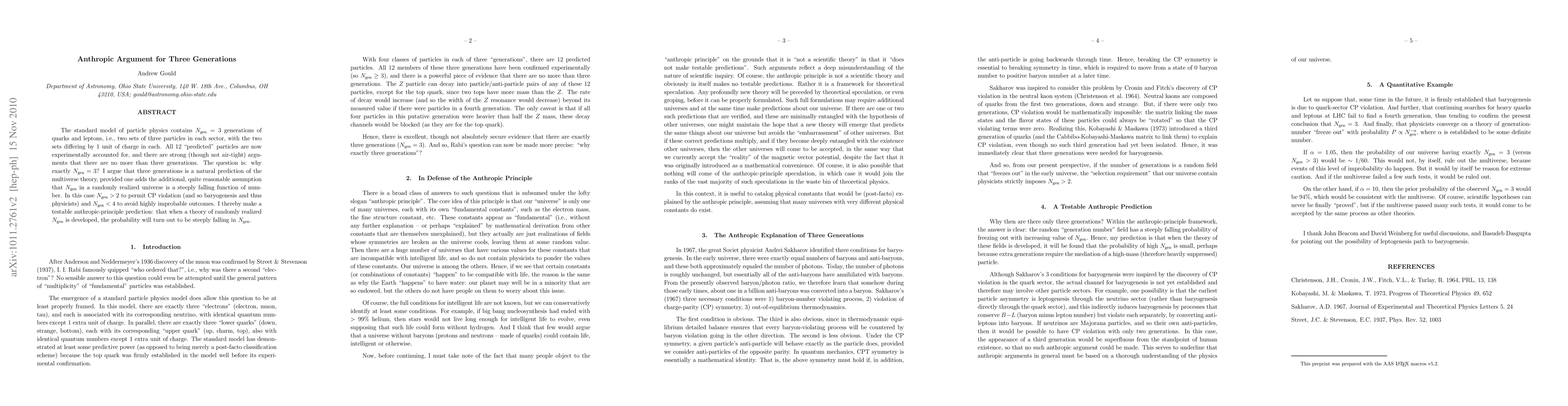 The paper argues that the existence of exactly three generations in the standard model of particle physics is a natural prediction of multiverse theory, with the anthropic principle suggesting a steeply falling probability for higher generations to avoid improbable outcomes. This prediction can be tested in future theories of randomly realized generations.